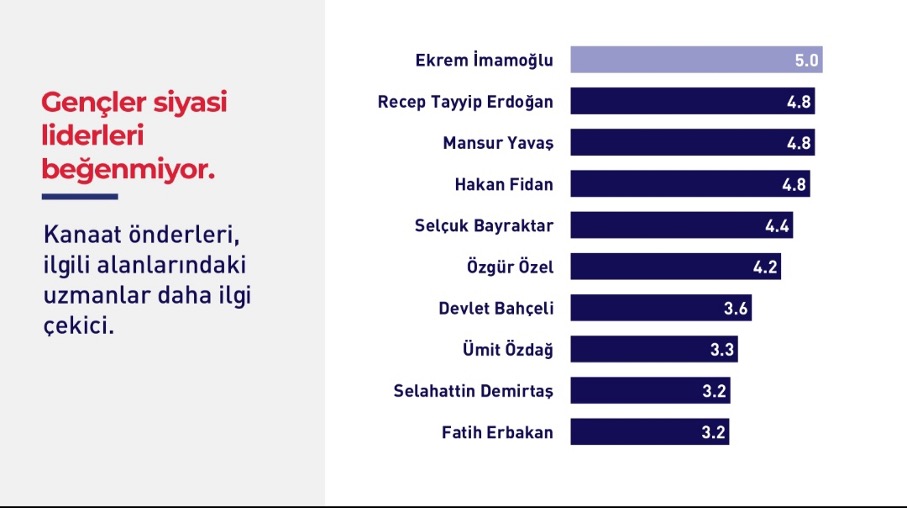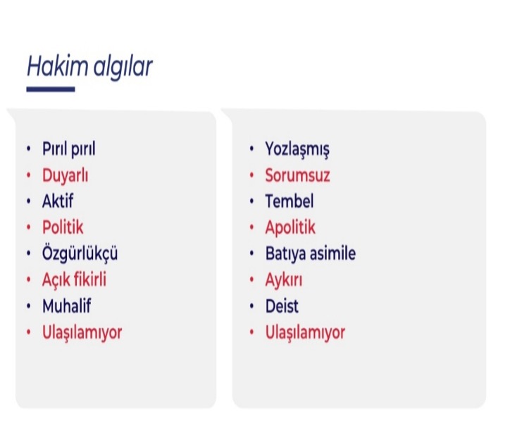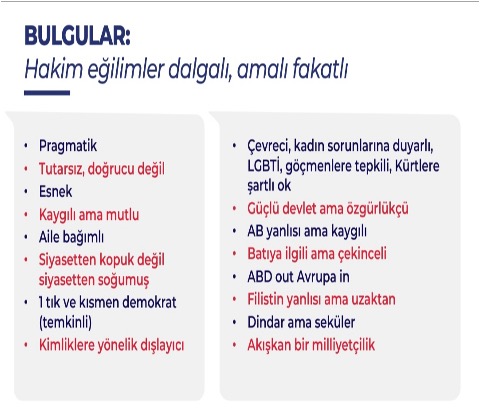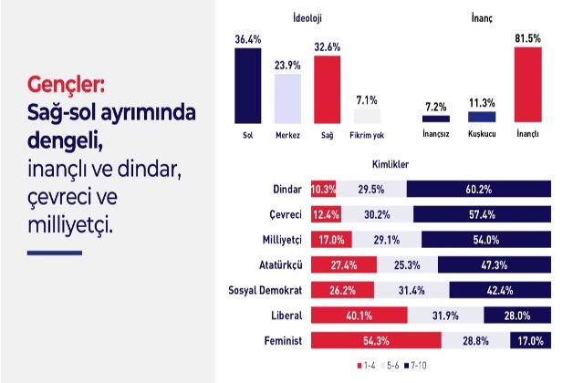 Araştırmacı Özge Genç, gençlerin siyasi liderleri beğenmediğine, güven puanlarının çok düşük olduğuna dikkat çekerek “hiçbir liderin 10 üzerinden 5’i geçememesi, çözümün kurallarda arandığını gösteriyor” dedi. Prof. Dr. Mesut Yeğen’e göre ise gençlerde “buralı ve milli olmaktan vazgeçmeyişimizin maliyeti medeniyetten, iyi bir hayattan vazgeçmek olmasın” bakışı ortalama şekilde seyrediyor. Kürtler “yerli ve milli” bulunuyorlar. Gençlerde Allah inancının yüksek, “Cumhuriyetin vatandaşlarından oluşan biz” fikrinin içselleştirildiğinden bahsedilebilir olduğu kaydedildi.