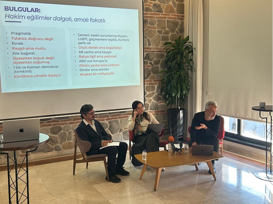 Araştırmacı Özge Genç, gençlerin siyasi liderleri beğenmediğine, güven puanlarının çok düşük olduğuna dikkat çekerek “hiçbir liderin 10 üzerinden 5’i geçememesi, çözümün kurallarda arandığını gösteriyor” dedi. Prof. Dr. Mesut Yeğen’e göre ise gençlerde “buralı ve milli olmaktan vazgeçmeyişimizin maliyeti medeniyetten, iyi bir hayattan vazgeçmek olmasın” bakışı ortalama şekilde seyrediyor. Kürtler “yerli ve milli” bulunuyorlar. Gençlerde Allah inancının yüksek, “Cumhuriyetin vatandaşlarından oluşan biz” fikrinin içselleştirildiğinden bahsedilebilir olduğu kaydedildi.