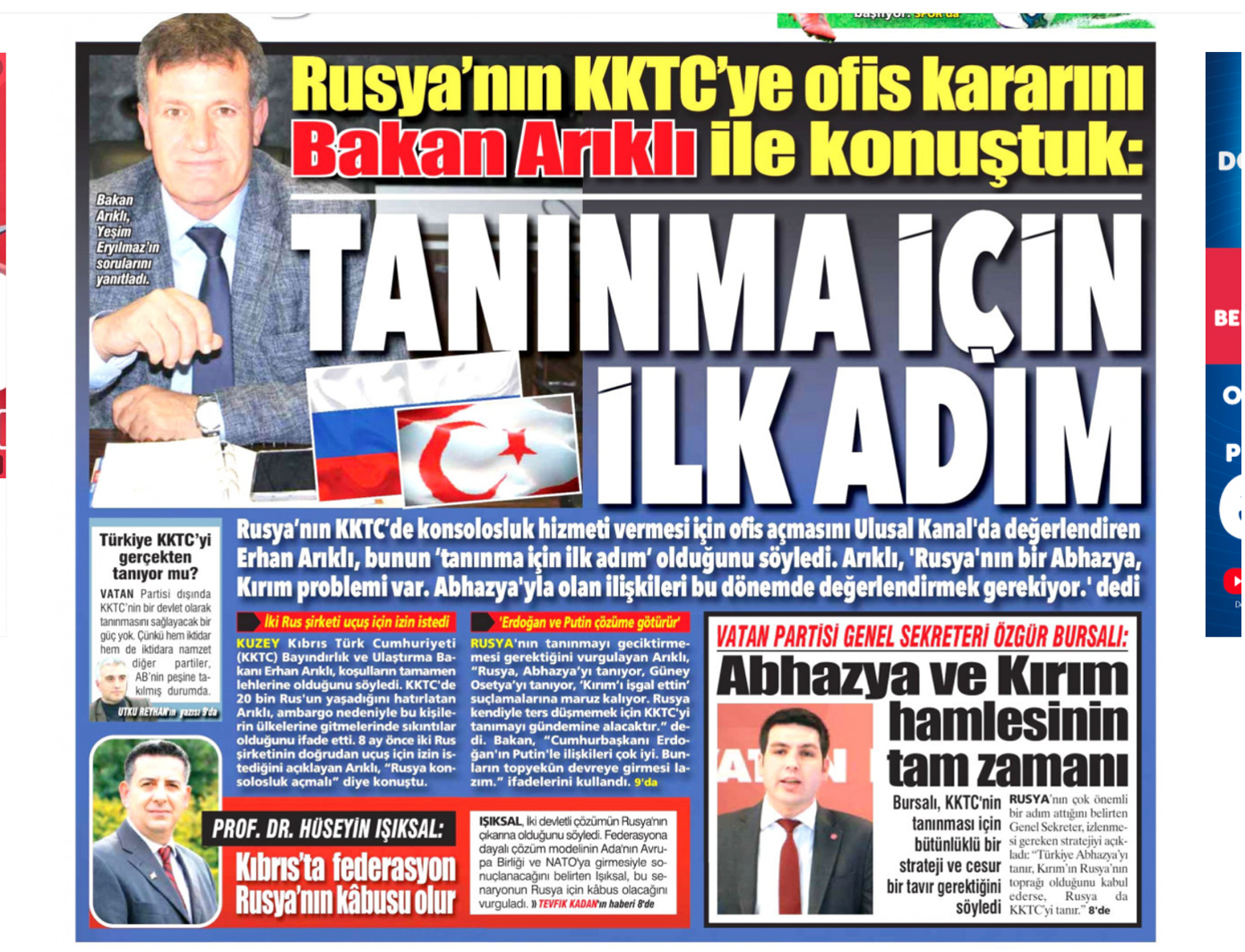 Vatan Partisi Genel Sekreteri Özgür Bursalı da “Türkiye Abhazya’yı tanır, Kırım’ın Rusya’nın toprağı olduğunu kabul ederse, Rusya’da KKTC’yi tanır” dedi.