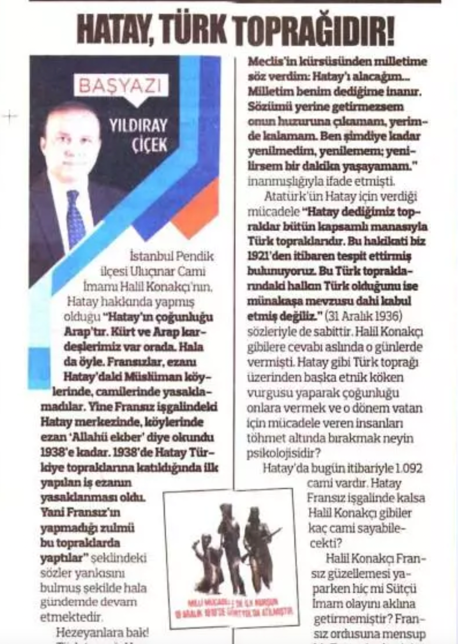 • MHP’nin yayın organı Türkgün gazetesinin başyazarı, Bahçeli’nin danışmanı Yıldıray Çiçek; imam Halil Konakçı’nın Hatay ile ilgili sözlerine sert tepki gösterdi: “Birisi ‘Kurtuluş Savaşı’nda keşke Yunan galip gelseydi’ der, diğeri Hatay’da Fransız güzellemesi yapar. (…) Bunu yapanların Atatürk’ün bizzat kurduğu Diyanet İşleri Başkanlığı’nda çalışan olması da çok acı bir olaydır.”