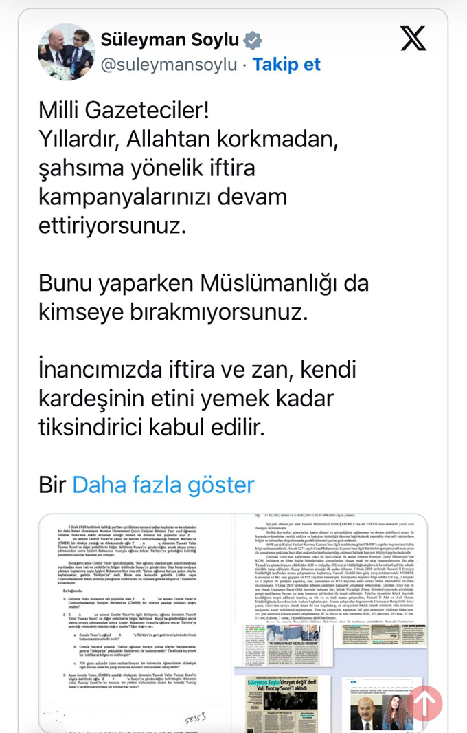Soylu, bir soru önergesine verdiği yanıtta yer alan “Vali Tuncay Sonel hakkındaki iddiaların asılsız olduğu anlaşılmıştır” şeklindeki ifadelerinin yer aldığı belgeleri haberleştiren gazete ve basın kuruluşlarını hedef aldı.