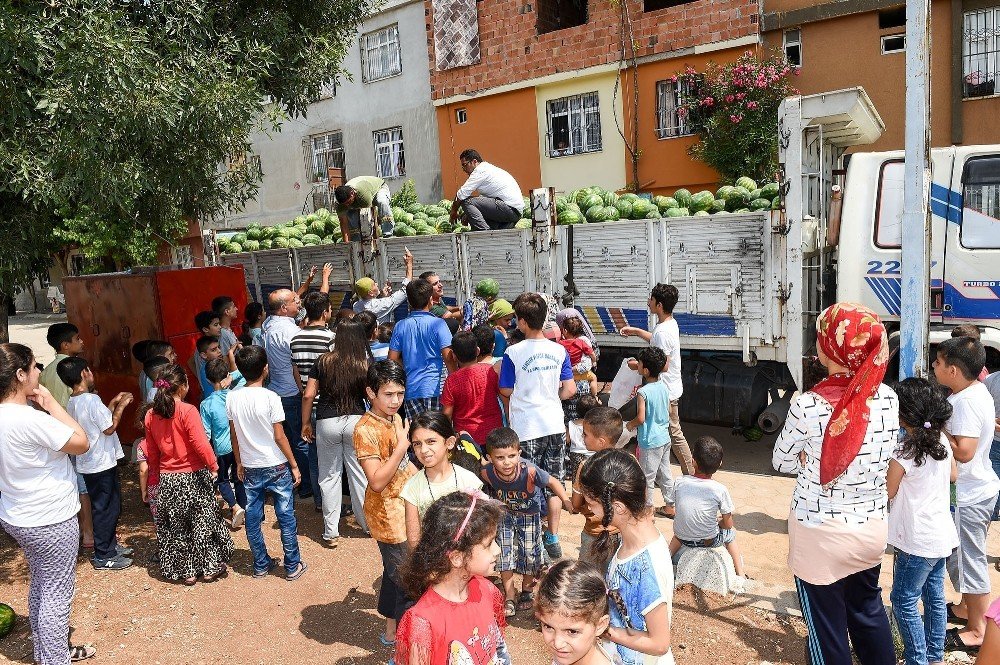 Bu kapsamda Belediye Başkanı Zeydan Karalar'ın da katılımıyla Denizli ve Mithatpaşa Mahallelerinde yaşayan vatandaşlara 20 ton karpuz dağıtıldı.