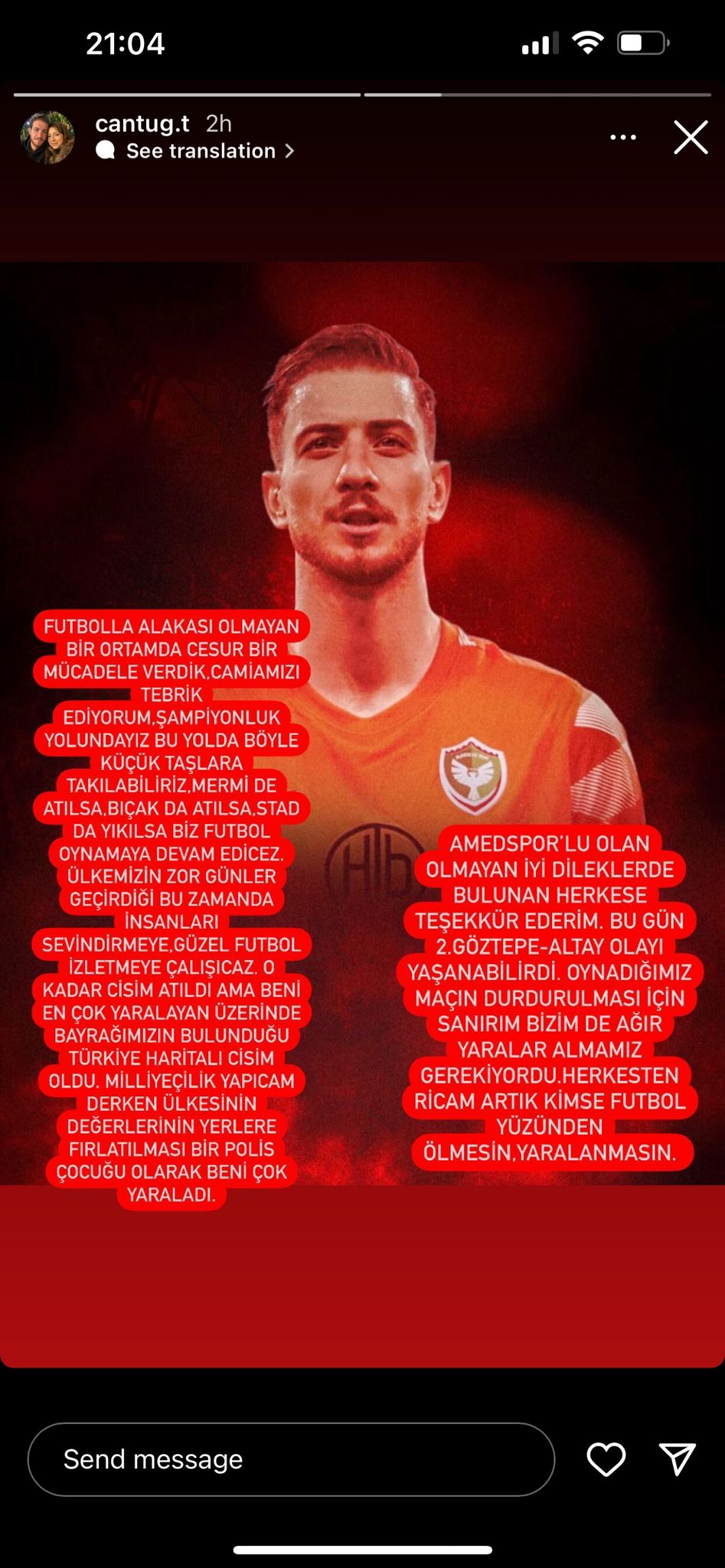 Maçın ardından sosyal medya hesabından yazılı bir açıklama yapan Amedspor Kalecisi Cantuğ Tekin, kendisinin bir polis çocuğu olduğunu belirterek şu açıklamayı yaptı: