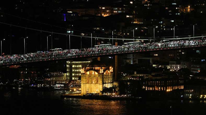 Ellerinde Türk bayraklarıyla Boğaziçi Köprüsü gişelerine ulaşan kalabalık burada zaman zaman meşale yakıp "Şehitler ölmez, vatan bölünmez" sloganları attı. Darbe girişimi protesto edilirken hayatını kaybedenler anıldı.
