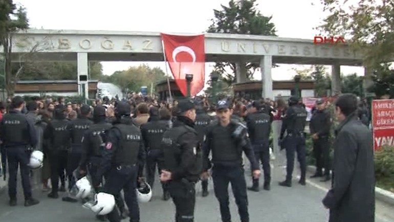 Öğrenci ve akademisyenlerden oluşan eylemciler, Boğaziçi Üniversitesi’nin Rumeli Hisarı Üstü’ndeki Güney Kampüsünde erken saatlerde toplanmaya başladı. Pankartlar açan grup, saat 13.00 sıralarında kampüsün giriş kapısına geldi. Polis kampüs dışında geniş güvenlik önlemi aldı.