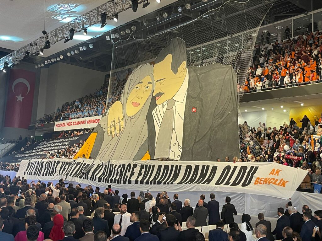 AK Parti kongresinde, Erdoğan kürsüye çıkınca tribünde annesiyle Erdoğan’ı gösteren poster açıldı.