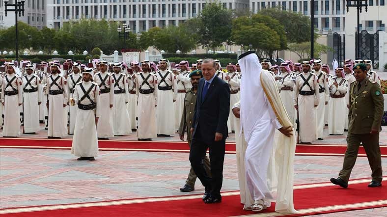 Cumhurbaşkanı Recep Tayyip Erdoğan, Katar Emiri Şeyh Temim bin Hamad Al Tani tarafından resmi törenle karşılandı. Katar Emirlik Divanı'nda gerçekleştirilen karşılama töreninde önce iki ülke milli marşları dinlendi.