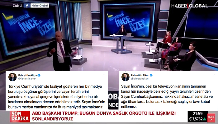 Global TV’de katıldığı canlı yayının kesilerek Cumhurbaşkanı Erdoğan’ın konuşmasının verilmesine tepki gösteren CHP’li Muharrem İnce, programı terk etti. İnce, “Ben konuşuyorum burada, 35 televizyon onu veriyor zaten. Türkiye bu faşist bir düzenden kurtulacak” dedi. İnce’nin yayını terk etmesini eleştiren Fahrettin Altun, “Sayın Cumhurbaşkanımız hakkında haksız, mesnetsiz ve ağır ithamlarda bulunarak takındığı suçlayıcı tavır kabul edilemez,” paylaşımını yaptı.