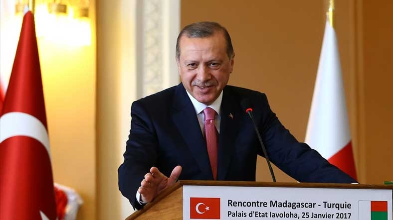 Cumhurbaşkanı Recep Tayyip Erdoğan, resmi ziyaret için gittiği Madagaskar’da ev sahibi Cumhurbaşkanı Hery Rajaonarimampianina ile birlikte ortak basın toplantısı düzenledi. Başkanlık sistemine geçişi öngören anayasa değişikliğiyle ilgili referandum için onayına ihtiyaç duyulan Erdoğan, “Fazla uzatmadan kararımızı vereceğiz” dedi.