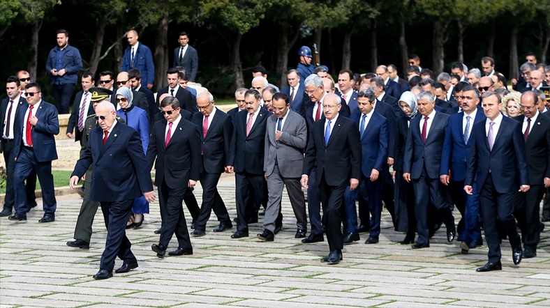 Anıtkabir'i ziyaret eden kalabalık heyet, Aslanlı Yol'dan geçerek Atatürk'ün mozolesine geldi. TBMM Başkanı Kahraman'ın mozoleye çelenk bırakmasının ardından, saygı duruşunda bulunuldu, İstiklal Marşı okundu.