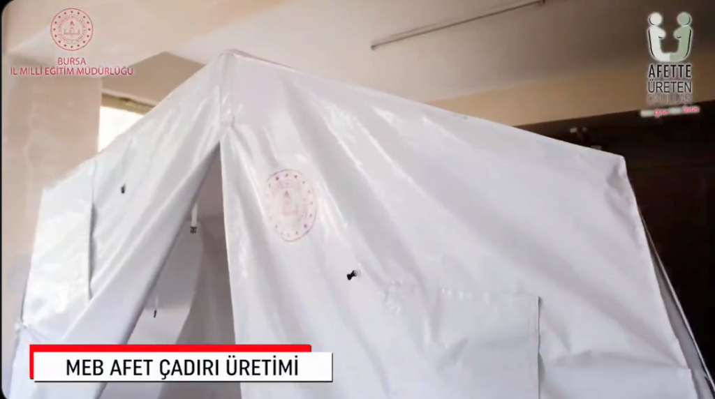 Milli Eğitim Bakanı Mahmut Özer, Bursa’daki bazı okullarda atölyeler kurulduğunu ve bu atölyelerde çadır üretimi yapıldığını söylemişti. Özer’in açıklamasına göre, AFAD standartlarında üretilen 410 adet afet çadırı, TIR’lara yüklenerek 22 Şubat’ta Bursa’dan deprem bölgesine gönderilmişti.
