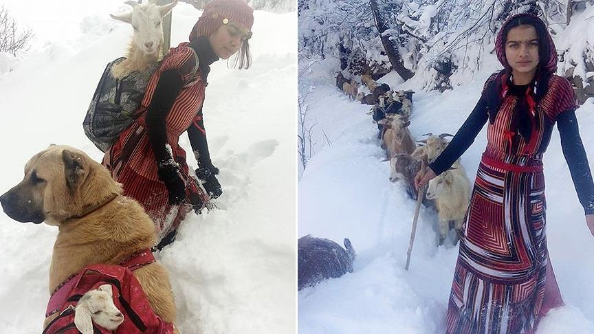 Rize'de, yeni doğum yapmış keçiyi sırtına alan, yavrusunu da çoban köpeğinin sırtına bağladığı okul çantasına koyan kızın karla kaplı dik yolda evine ulaşmaya çalışırken çekilen fotoğrafı, sosyal medyada paylaşım ve beğeni rekoru kırdı.