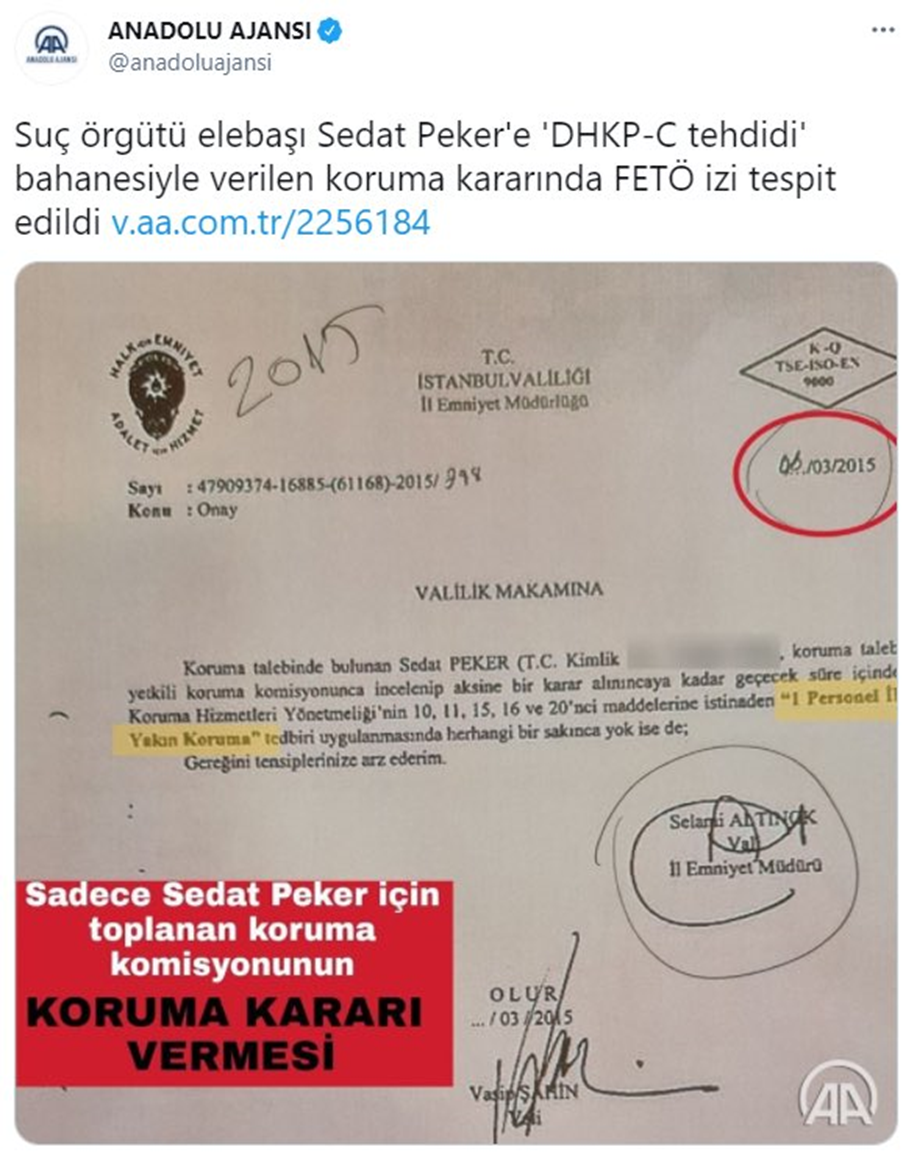 Soylu’nun açıklamasının ardından Anadolu Ajansı (AA), Peker’e koruma kararıyla ilgili belgeyi “Koruma kararında FETÖ izi tespit edildi” diye haberleştirmişti.