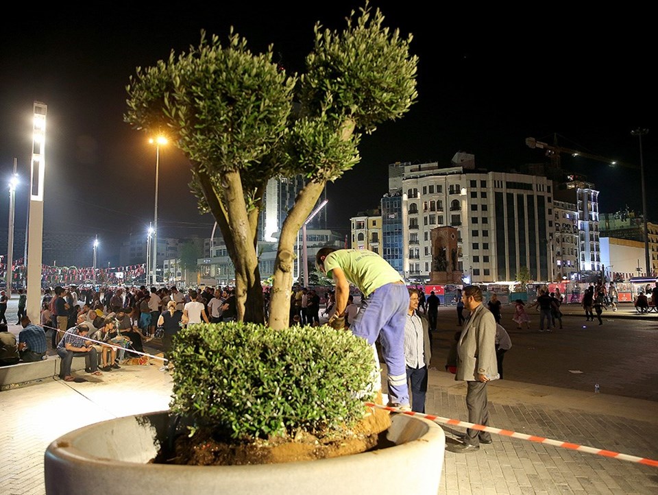 Taksim Meydanı'na gece saatlerinde ağaçlandırma çalışması yapıldı. İstanbul Büyükşehir Belediyesi ekipleri tarafından daha önce dikilen 30 ağacın ardından bu gece dikilen 20 ağaçla birilkte çalışmalar tamamlandı.