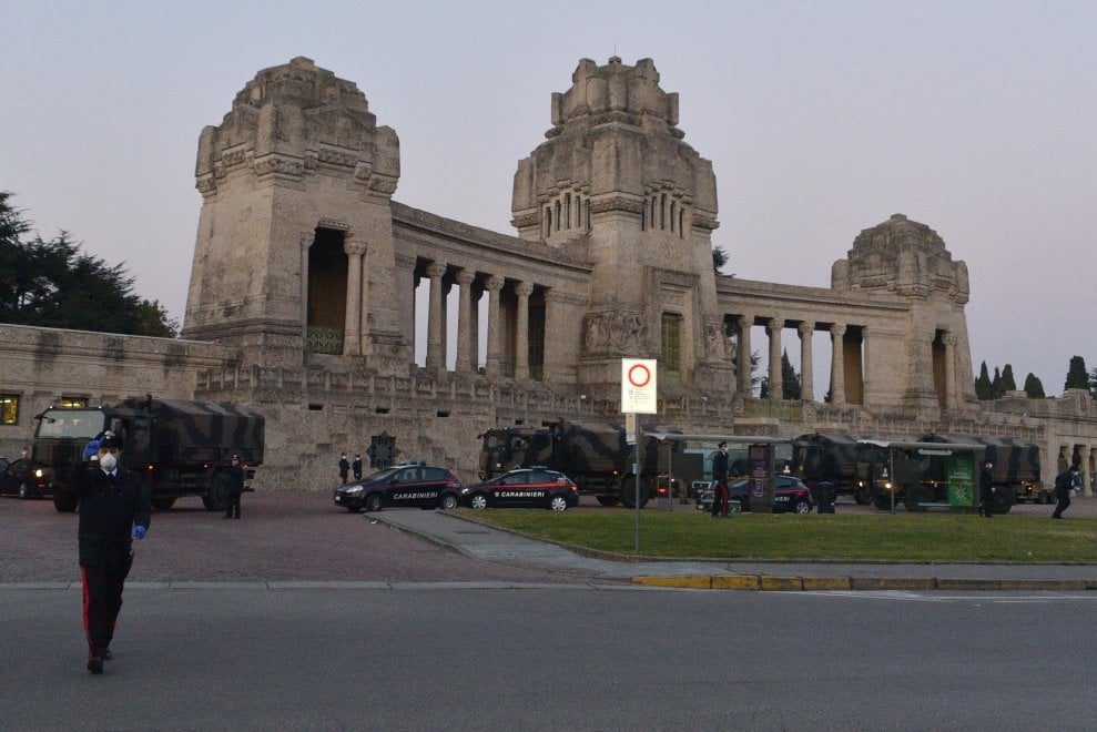 Şehirde yakılarak defnedilmek isteyenler için bir krematoryum bulunmakta ve 24 saat hizmet vermesine rağmen koronavirüsten ölümlerin fazlalığı nedeniyle talebe yetişemiyor. Eyalet yetkilileri çözümü askeri araçlarla cenazeleri başka şehirlere nakletmekde buldu. Bergamo merkezine gelen askeri araçlar, morg önünde uzun kuyruklar oluşturdu. İkinci Dünya Savaşı'ndan sonra İtalya'da cenazeler için ilk kez böyle bir görüntü oluştuğu İtalyan basınına yansıdı.