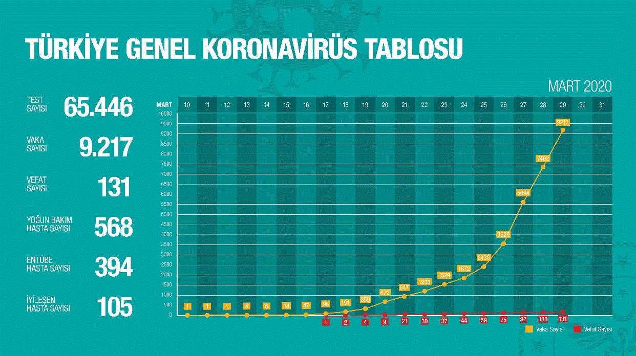 Bakan Koca'nın açıkladığı son verilerin ardından Türkiye'de Kovid-19 salgını nedeniyle hayatını kaybedenlerin sayısı 131'e, toplam vaka sayısı ise 9 bin 217'ye yükseldi.