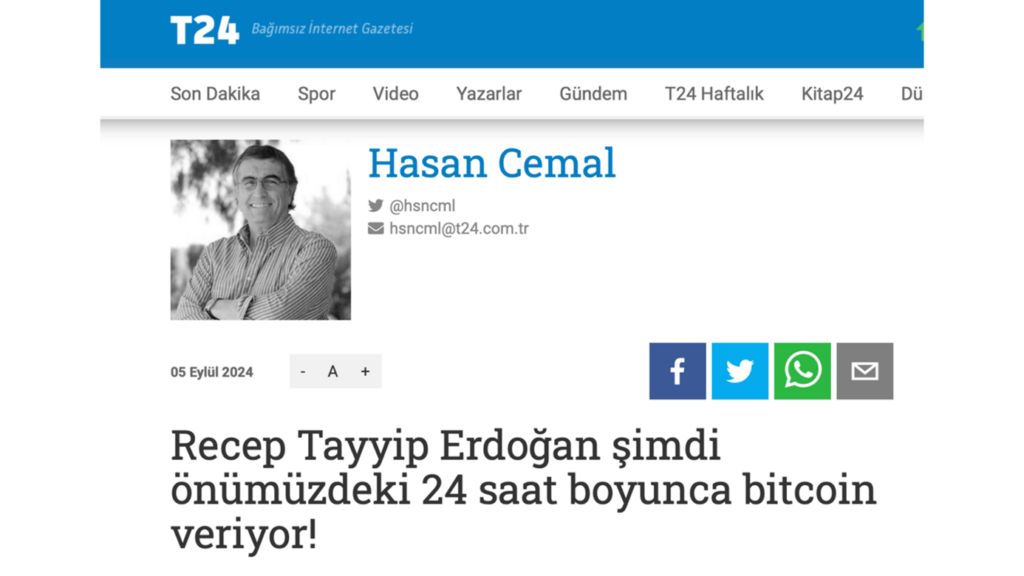 T24 yazarlarından Hasan Cemal imzası ve “Recep Tayyip Erdoğan şimdi önümüzdeki 24 saat boyunca bitcoin veriyor!” başlığıyla yayımlanan yazıda “Recep Tayyip Erdoğan