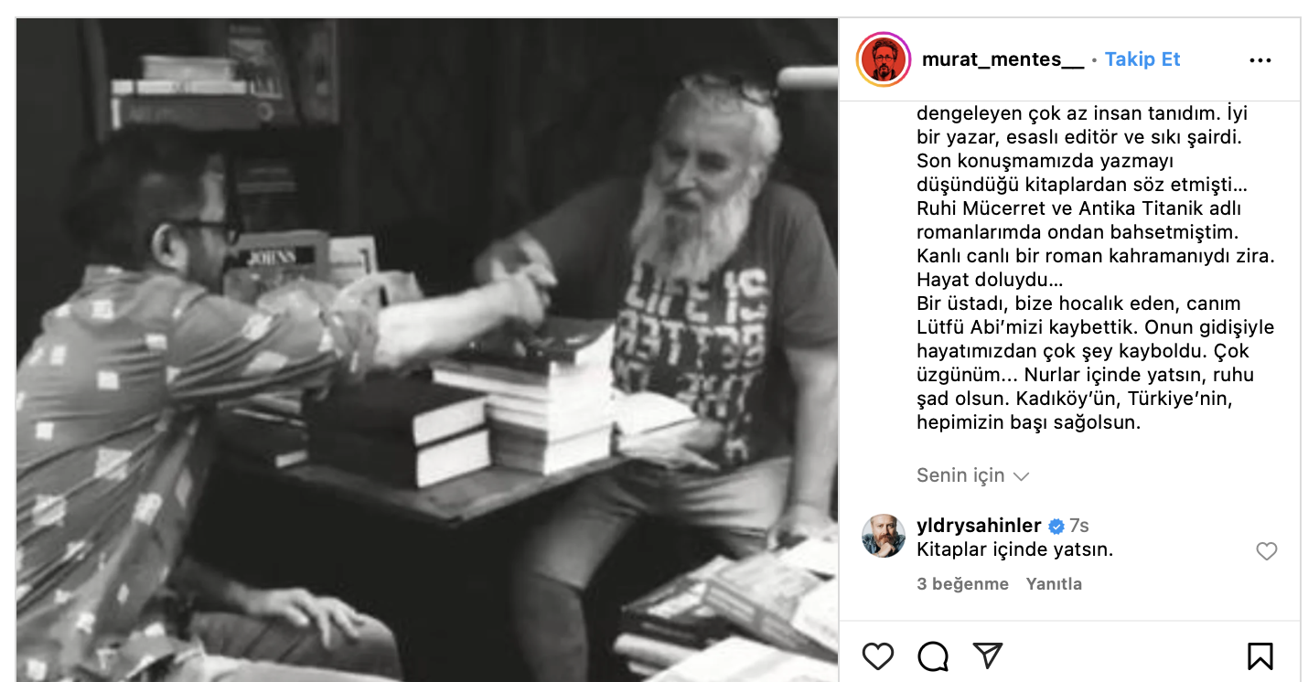 Bir üstadı, bize hocalık eden, canım Lütfü Abi’mizi kaybettik. Onun gidişiyle hayatımızdan çok şey kayboldu. Çok üzgünüm… Nurlar içinde yatsın, ruhu şad olsun. Kadıköy’ün, Türkiye’nin, hepimizin başı sağolsun.”