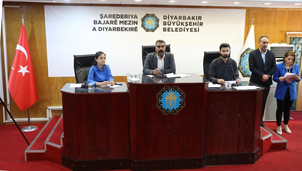 Diyarbakır Büyükşehir Belediyesi’nin X hesabından Belediye Meclisi toplantısında bayrağın görüldüğü fotoğraflar paylaşıldı.