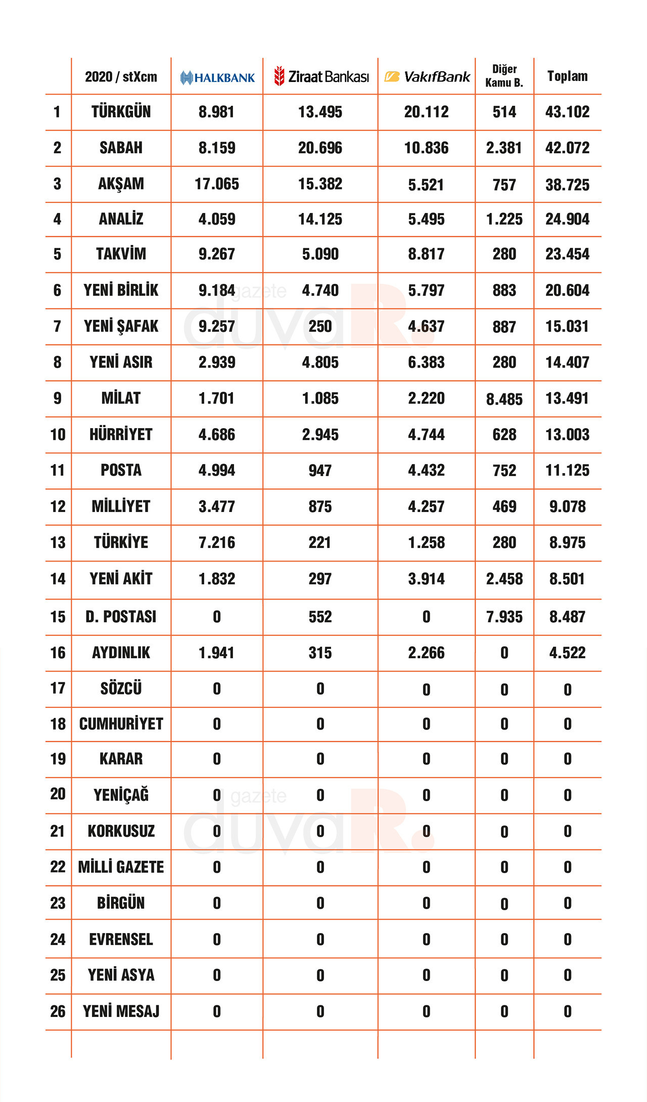 Kamu bankaları Sözcü gibi Yeniçağ, Korkusuz, Cumhuriyet, Karar, Evrensel, Birgün, Yeni Mesaj, Yeni Asya ve Millî Gazete’ye de ambargo uyguladı, hiç reklam vermedi. Buna karşın tiraj sıralamasında gerilerdeki gazeteler kamu bankası reklam sırasında aynı Takvim ve Yeni Asır gibi uçuşa geçerek baş köşelere oturdu. En çok kamu bankası reklamı alan gazeteler arasında birinci Türkgün, üçüncü Akşam ile birlikte Yeni Birlik, Milat, Diriliş Postası ve Yeni Akit de tirajda yanına yaklaşamadıkları gazeteleri bile kamu bankaları reklamları sıralamasında geride bıraktı. Kat kat fazla kamu reklamı alma yolunun rakiplerinden daha iyi gazetecilik yapıp tiraj arttırmaktan geçmediğini biliyorlar. Çok açık ki ödüllendirilmişler.