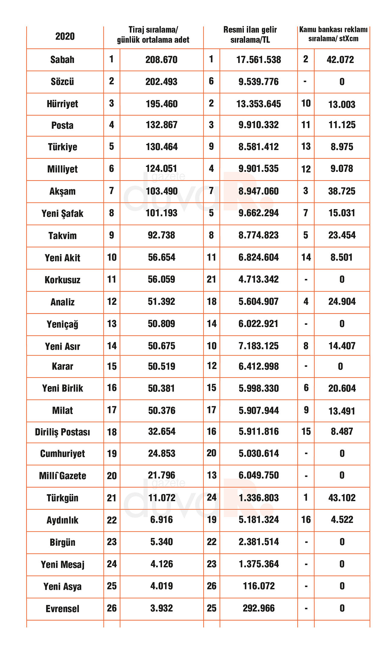 Listede ikinci sırada Sabah’ın yer alması şaşırtıcı değil. Sabah, doğruluğu tartışmalı da olsa, mevcut tiraj verilerine göre en çok satan üç gazeteden biri. Ancak bu gerekçeyle bankaların rekor düzeyde, 42 bin sütun-santim reklam vermesi, diğer çok satan gazetelere verilen reklama bakınca, doğal karşılanamaz. Hele hele 2020’de Hazine ve Maliye Bakanı’nın Berat Albayrak olduğu ve kamu bankalarının reklama boğduğu Sabah, Takvim ve Yeni Asır gazetelerine sahip Turkuvaz Grubu’nu bakan Albayrak’ın kardeşi Serhat Albayrak’ın yönettiği akıldan çıkarılmazsa.