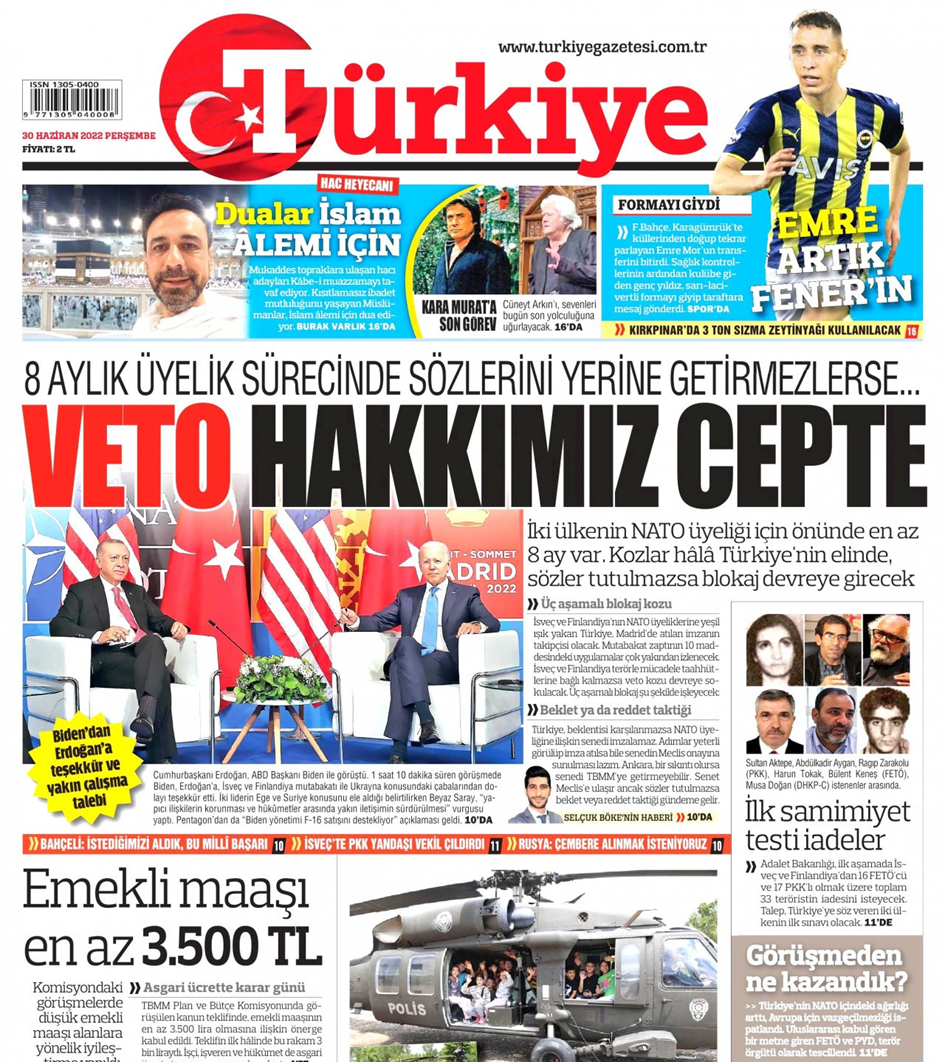 Gazete’nin haberinde İsveç ve Finlandiya’nın NATO üyeliği için sekiz aylık bir takvim olduğu hatırlatılarak, eğer verilen sözler tutulmazsa Türkiye’nin blokaj hakkını elde tuttuğu vurgulandı.