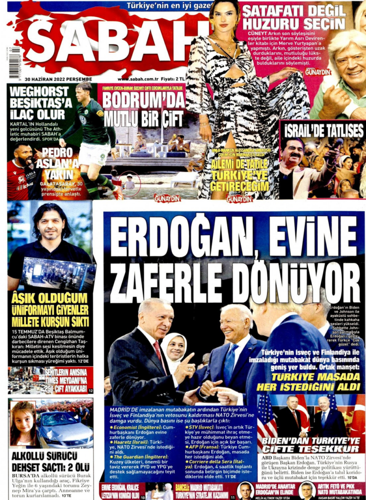 Sabah, 1. sayfasında manşetin altında “Türkiye masada her istediğini aldı” başlığını attı. Sabah bu başlığı “dünya basınının ortak manşeti” olarak sundu.