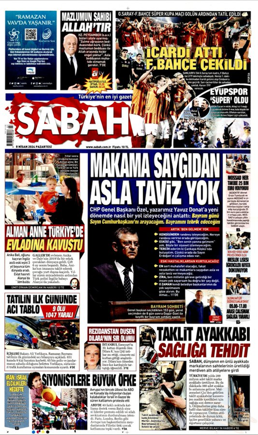 Berat Albayrak’ın ağabeyi Serhat Albayrak tarafından yönetilen iktidar medyasının amiral gazetesi Sabah, bugün sürpriz bir manşetle çıktı. CHP Genel Başkanı Özgür Özel’in Sabah yazarı Yavuz Donat’a verdiği röportajı Sabah manşetten verdi: “Makama saygıdan asla taviz yok” manşetiyle verilen röportajda Özel, röportajda Erdoğan’a sıcak mesajlar gönderdi: “Bayram günü Sayın Cumhurbaşkanı’nı arayacağım. Bayramını tebrik edeceğim. Eskisi gibi, “Ben senin yanına gelmem yok. Böyle bir siyaset izlemeyeceğim. Tercih ederim ki Çankaya Köşkü’nde buluşalım. Çünkü orada da Sayın Cumhurbaşkanı Erdoğan’ın odası var” Gazetenin birinci sayfasında Erdoğan ve AK Parti ile ilgili hiçbir haber yer almaması da dikkat çekti.
