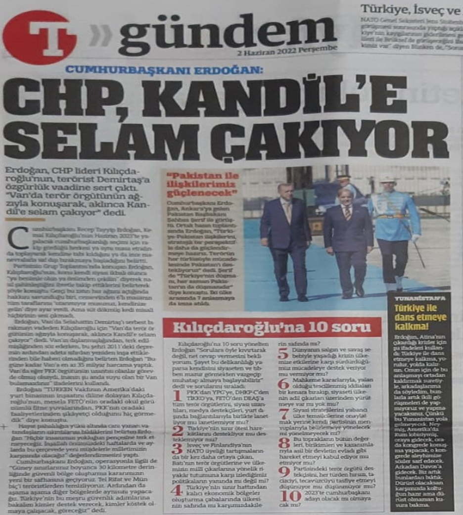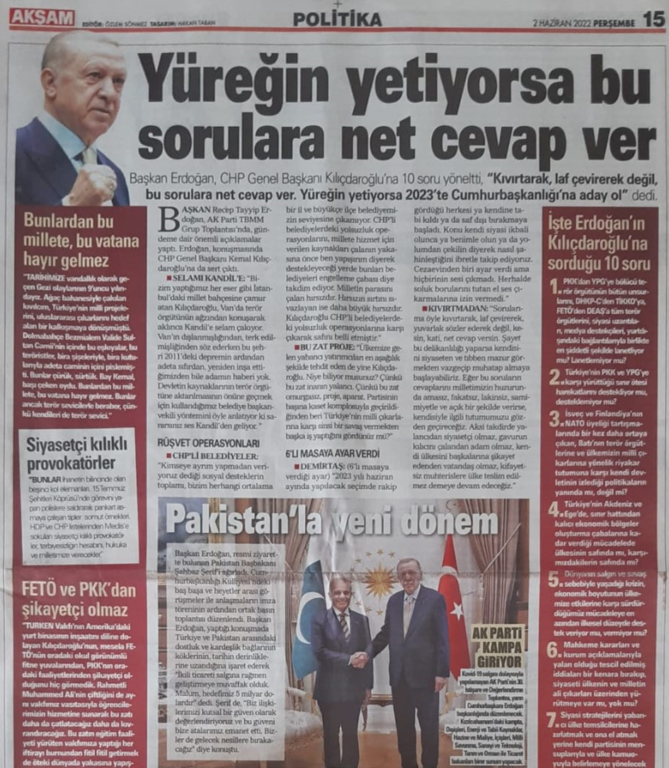 Akit’in 1. sayfasında Erdoğan’ın konuşmasıyla ilgili sadece Kılıçdaroğlu’na sorduğu 10 soru yer aldı.