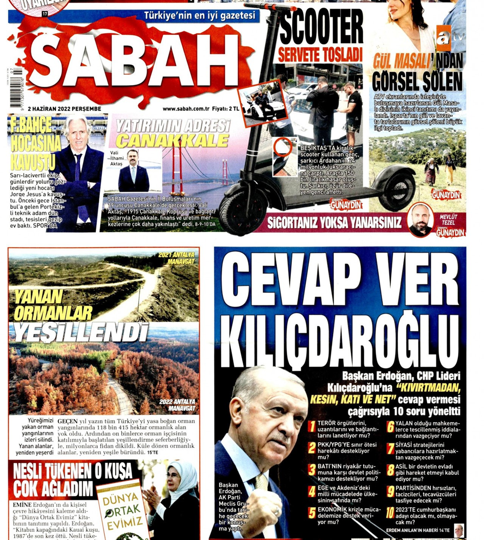 İktidar medyasında sözlere yer veren tek gazete olan Akşam da birinci sayfasına Erdoğan’ın konuşmasındaki Kılıçdaroğlu’na sorular bölümünü taşıdı.