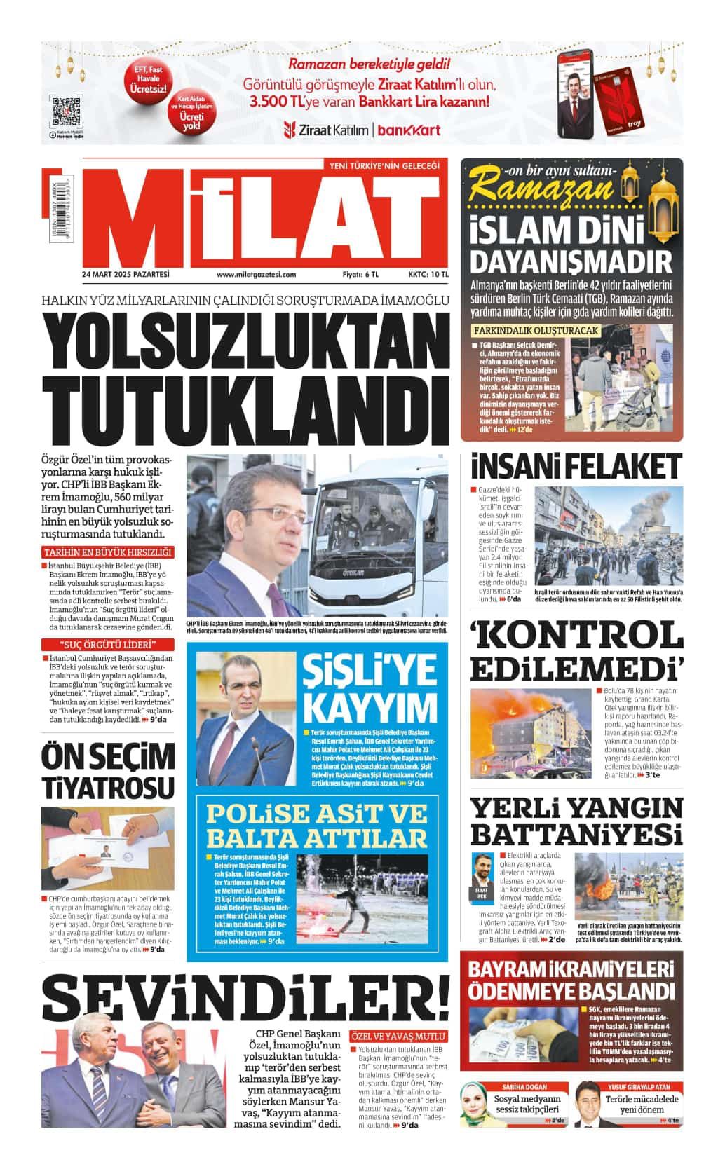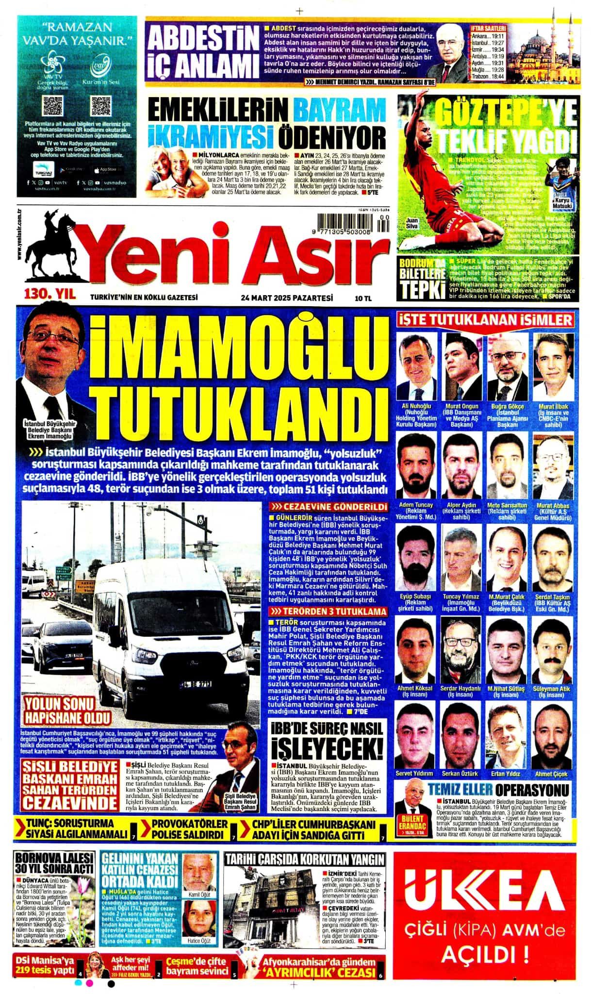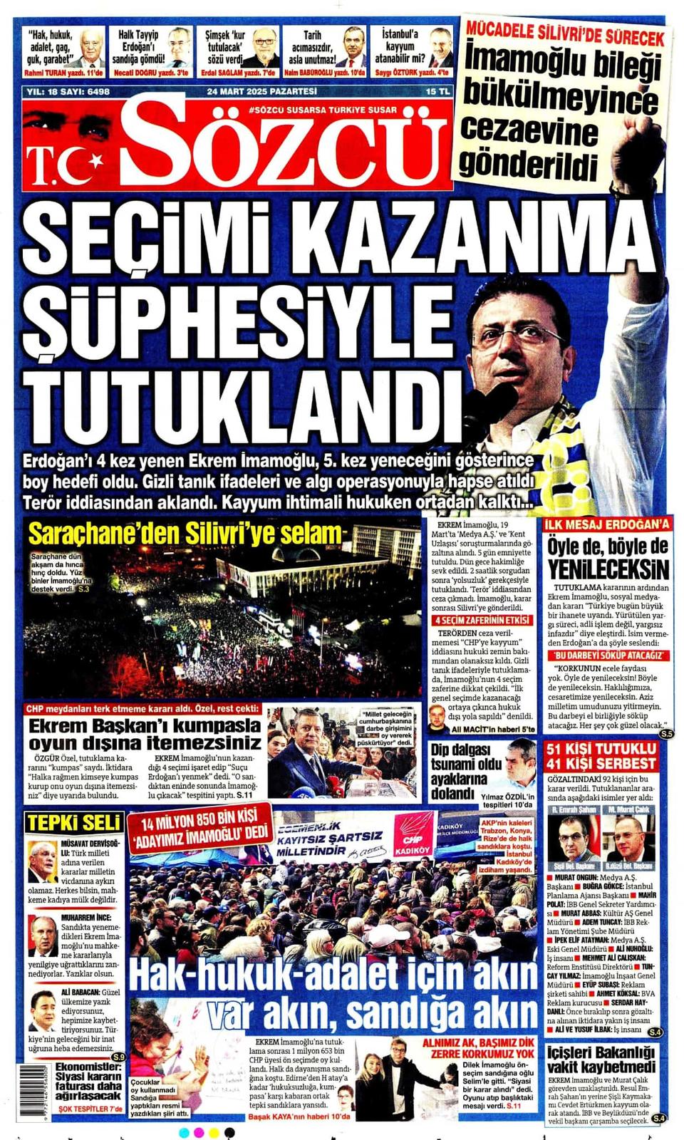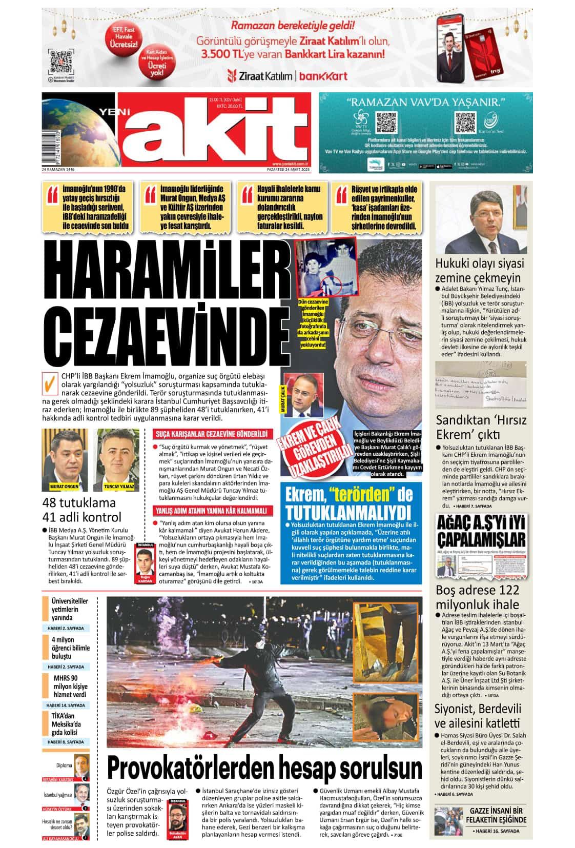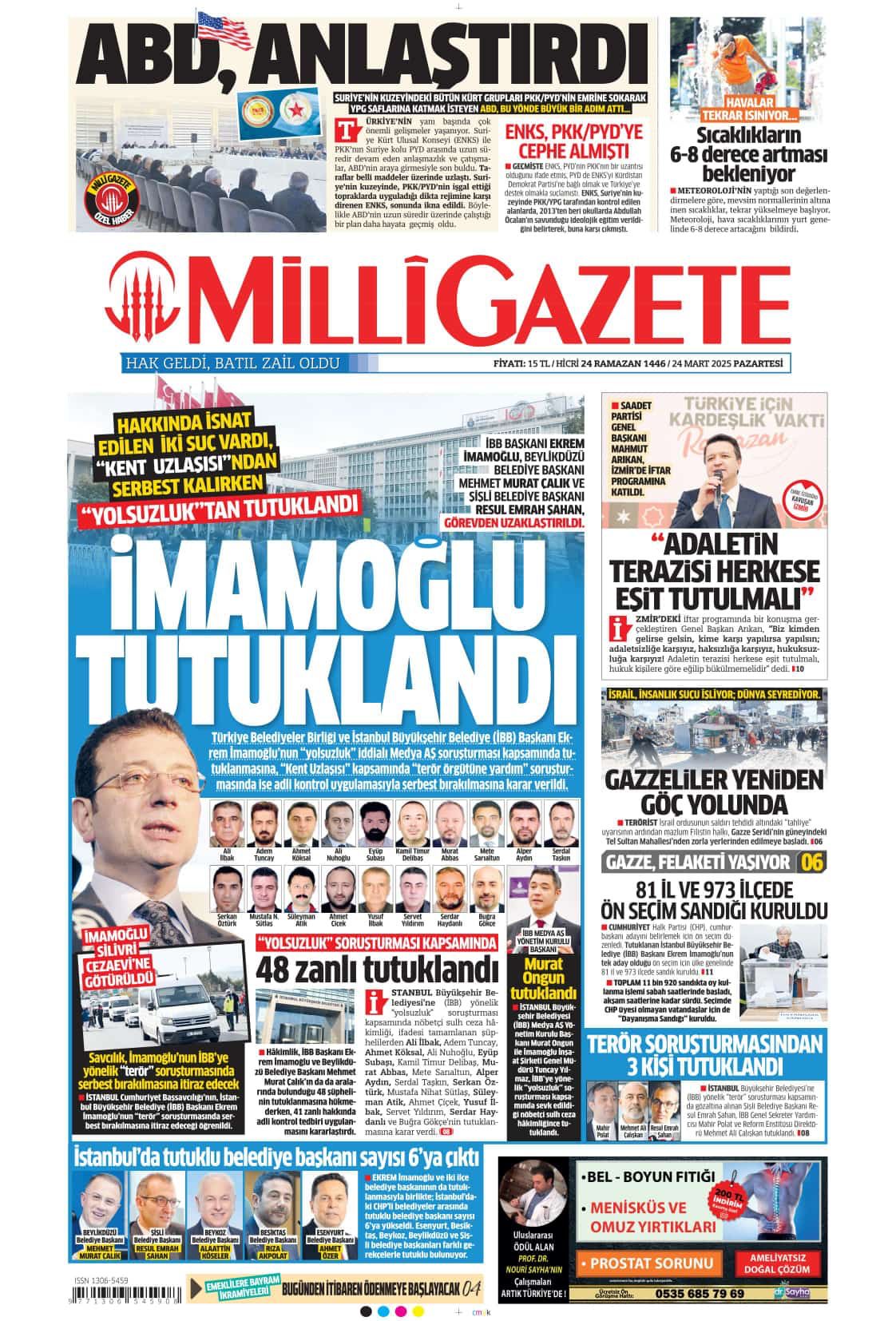 İBB Başkanı Ekrem İmamoğlu’nun tutuklanması gazetelerin manşetlerinde. İktidara yakın gazeteler ortak bir İmamoğlu manşetiyle çıktı: “Yolsuzluktan tutuklandı.”