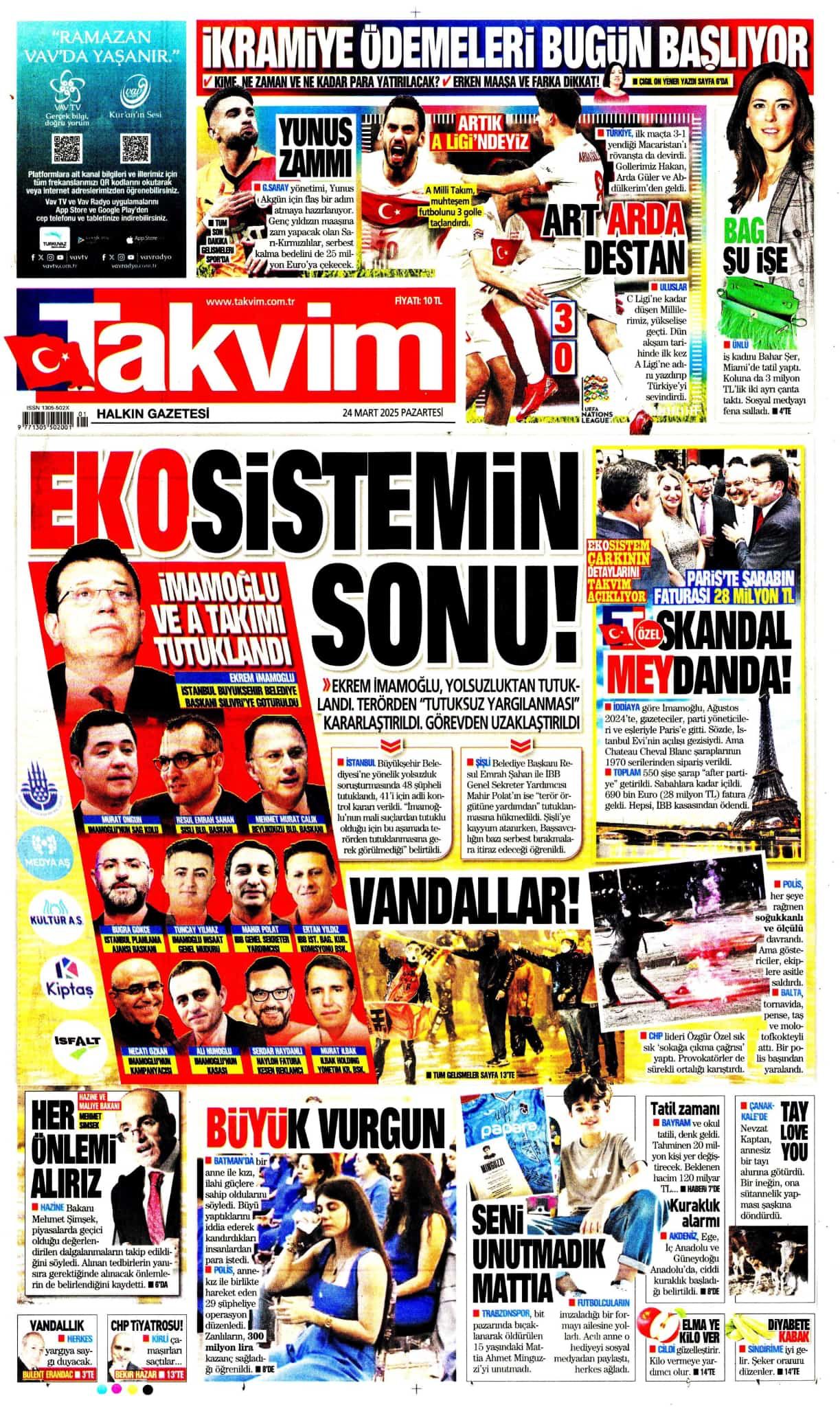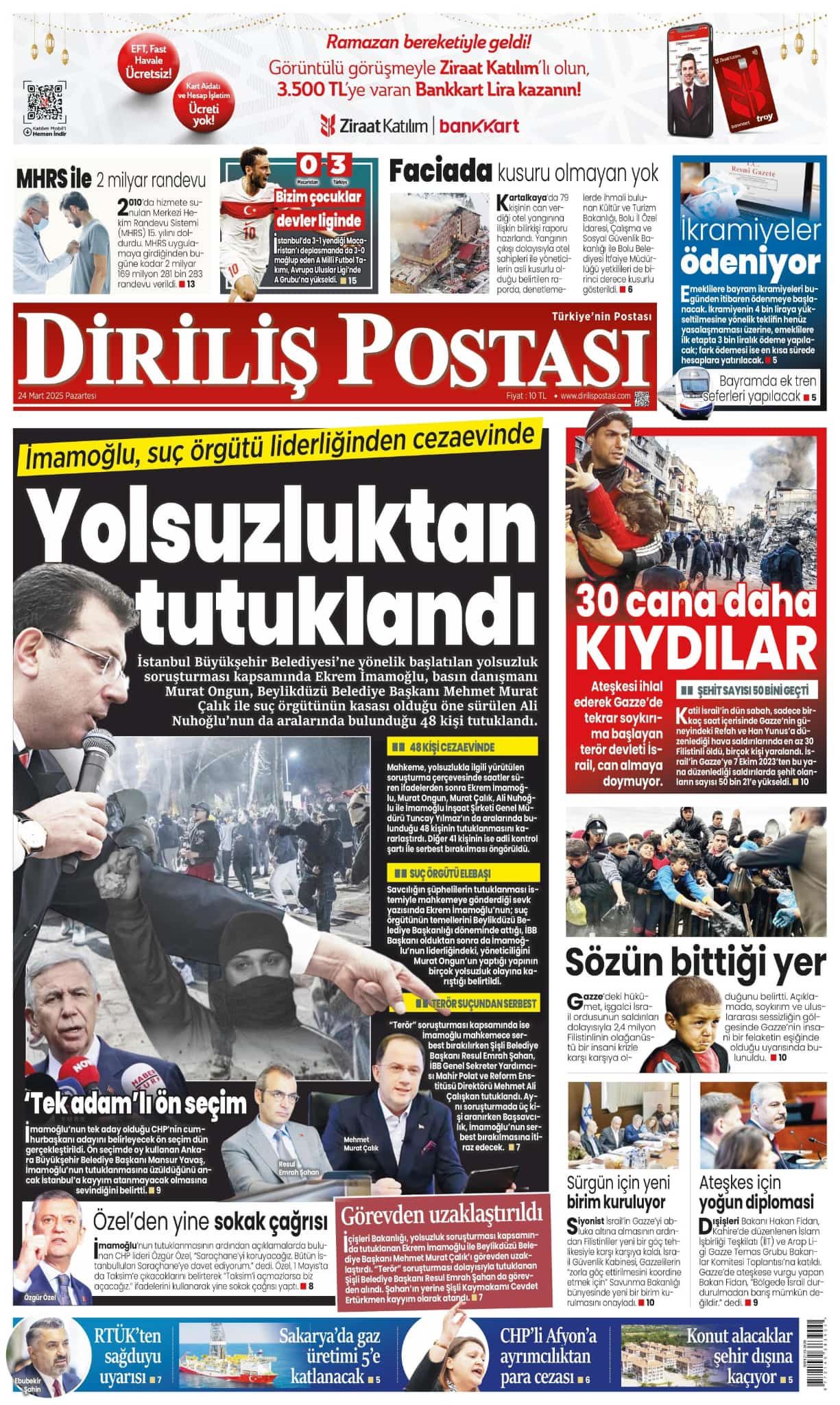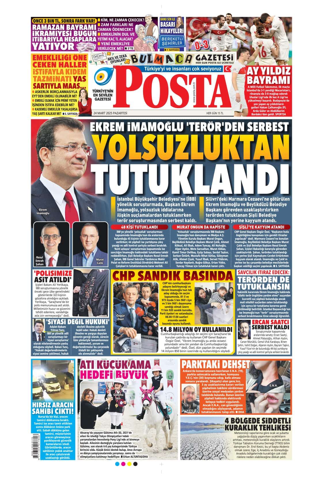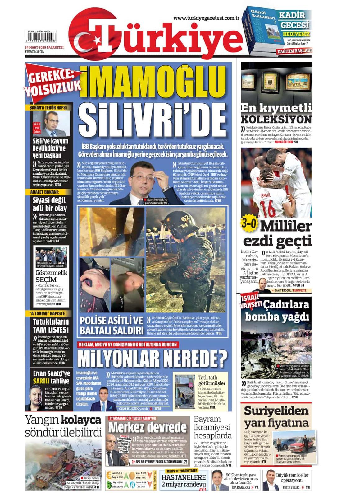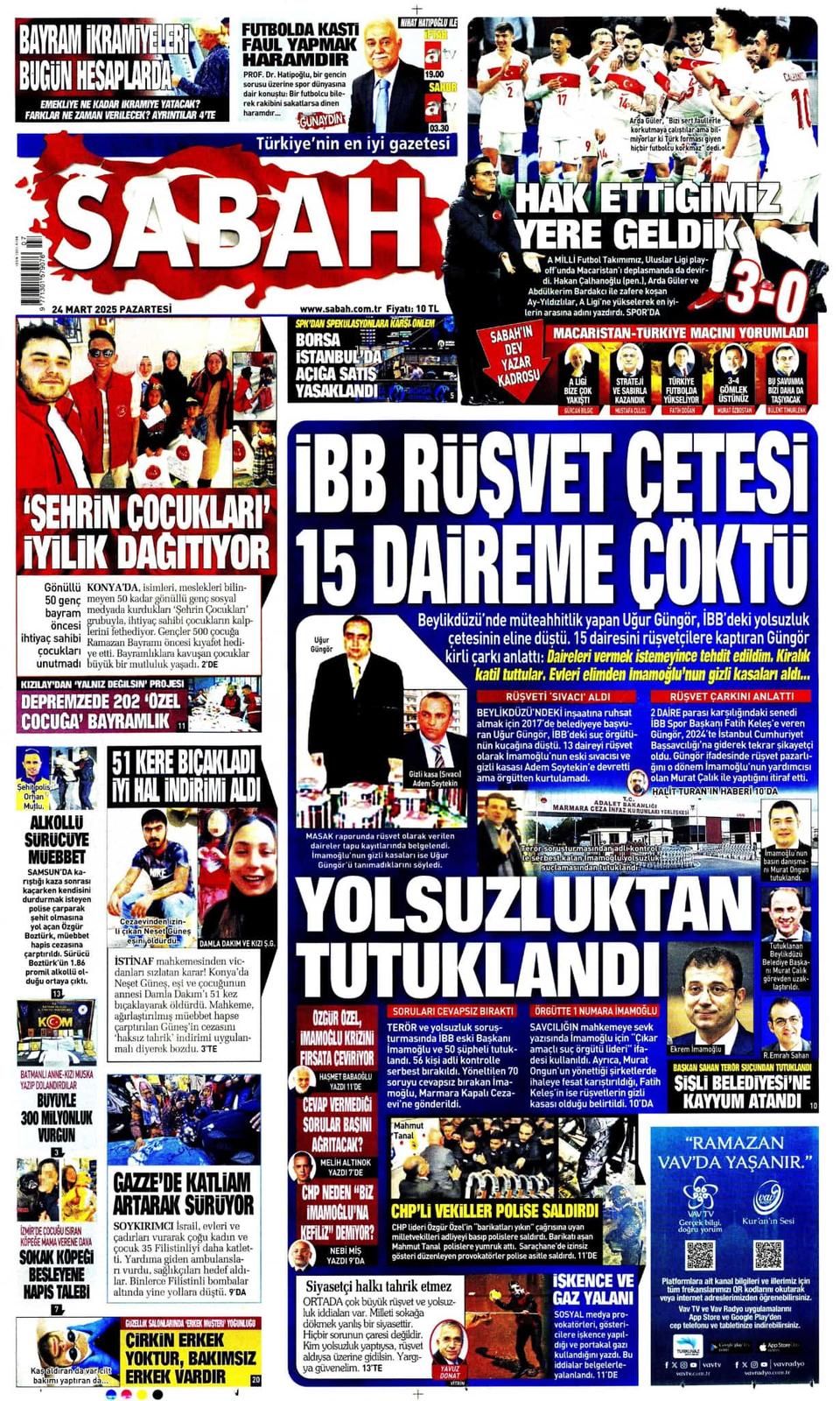 İBB Başkanı Ekrem İmamoğlu’nun tutuklanması gazetelerin manşetlerinde. İktidara yakın gazeteler ortak bir İmamoğlu manşetiyle çıktı: “Yolsuzluktan tutuklandı.”