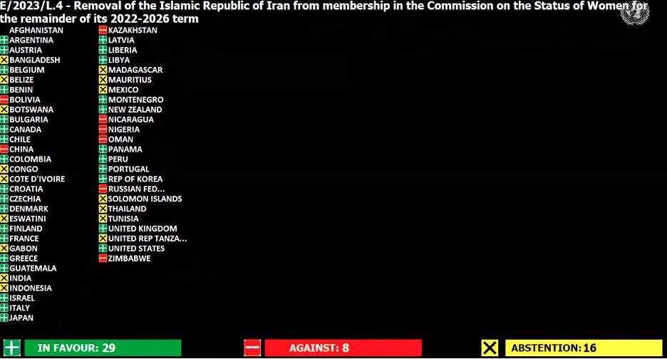 Ekonomik ve Sosyal Konsey üyesi 54 ülkenin 29’u lehte oy verirken Rusya, Çin, Bolivya, Kazakistan dahil 8 ülke İran lehine oy kullandı, 16 üye ise oylamaya katılmadı.