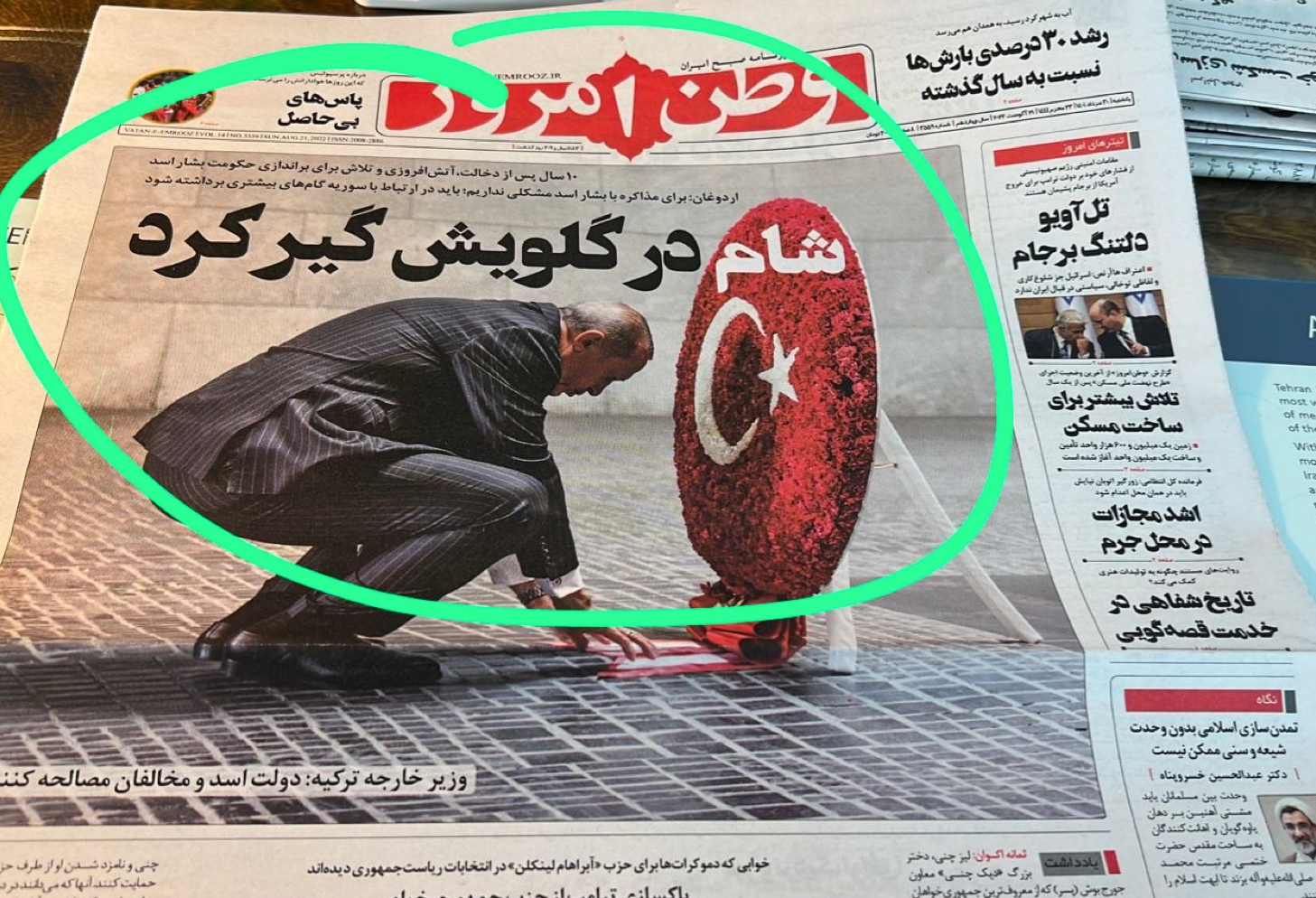 Bugün İran’da çıkan “Vatan-ı Emruz” gazetesi Cumhurbaşkanı Erdoğan’ı manşetine taşıdı ve Türk bayrağı motifli bir çelengi yere bırakmak için eğilirken çekilmiş bir fotoğrafının üstüne “Şam boğazına takıldı” manşetini attı.