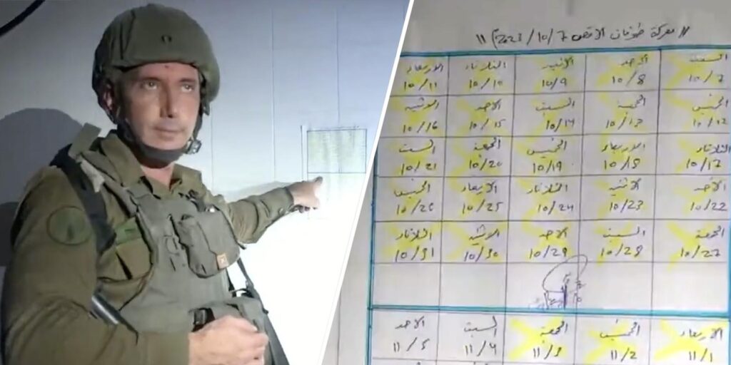 Hagari, hastane bodrumunun duvarına yapıştırılmış ve el yazısıyla kaleme alınan Arapça çizelge için “Bu listenin (başında) Arapça ‘İsrail’e karşı 7 Ekim’de başlayan bir operasyondayız’ (yazıyor). Bu her teröristin kendi ismini yazdığı bir gardiyan listesi. Her teröristin de buradaki (odadaki) insanları gözetlemek için kendi vardiyası var” ifadesini kullandı.