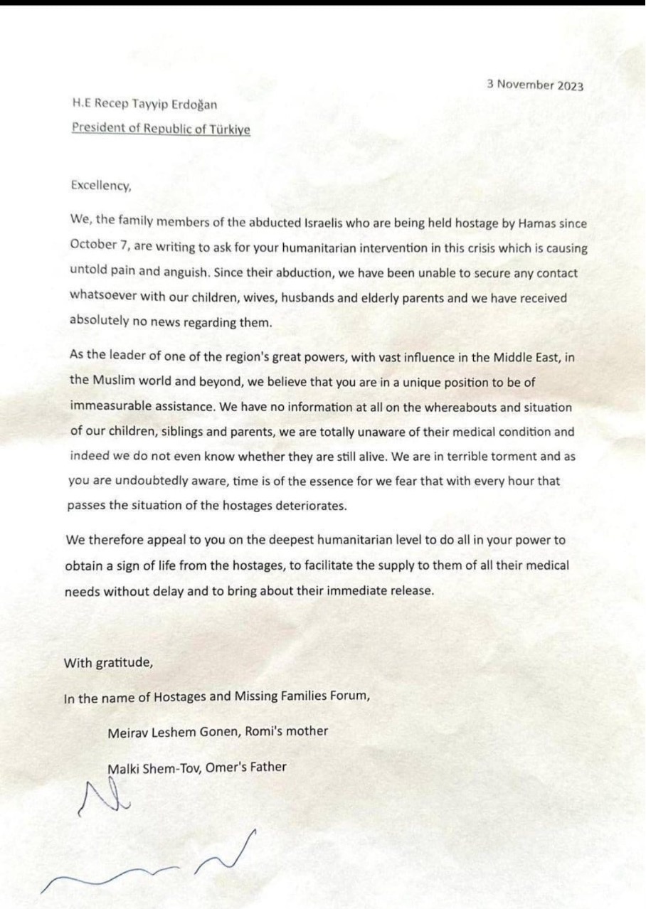Bölgenin büyük güçlerinden birinin lideri ve Orta Doğu’da geniş etkisi olan biri olarak büyük destekte bulunabileceğiniz eşsiz bir konuma sahipsiniz. Çocuklarımızın, kardeşlerimizin ve ebeveynlerimizin nerede olduklarını bilmiyoruz. Sağlık durumlarından ve hayatta olup olmadıklarından haberimiz yok. Korkunç bir acı altındayız. Sizin de bildiğiniz gibi zaman çok önemli. Her geçen saat rehinelerin durumunun kötüleştiğinden endişeleniyoruz.