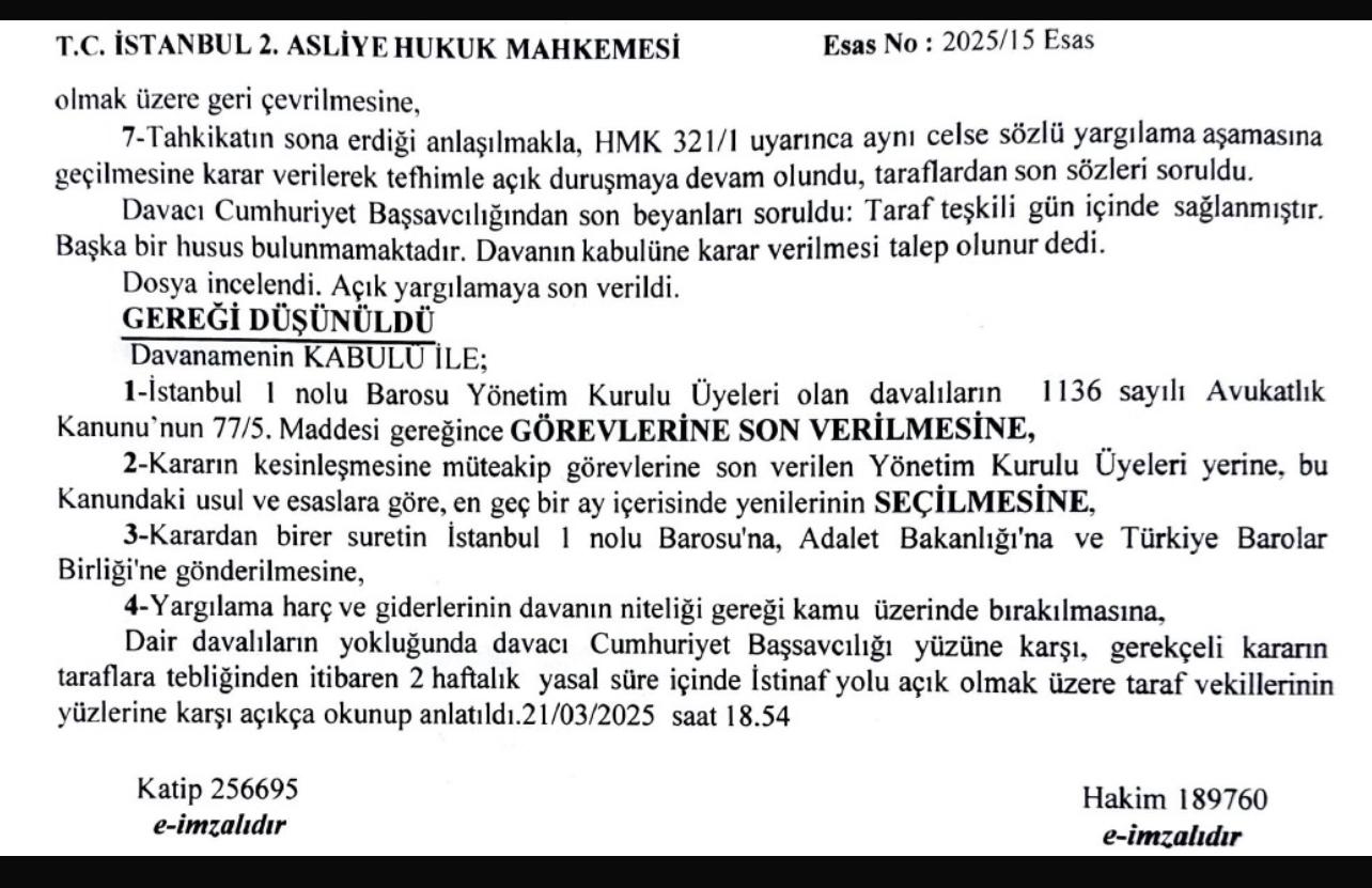 İstanbul 2. Asliye Hukuk Mahkemesindeki davada karar çıktı. İstanbul Barosu Başkanı İbrahim Özden Kaboğlu ve 10 kişilik yönetimin değiştirilmesi talebiyle açılan davada mahkeme, mevcut başkan ve yönetimin görevden alınmasına ve yeniden seçim yapılmasına karar verdi.