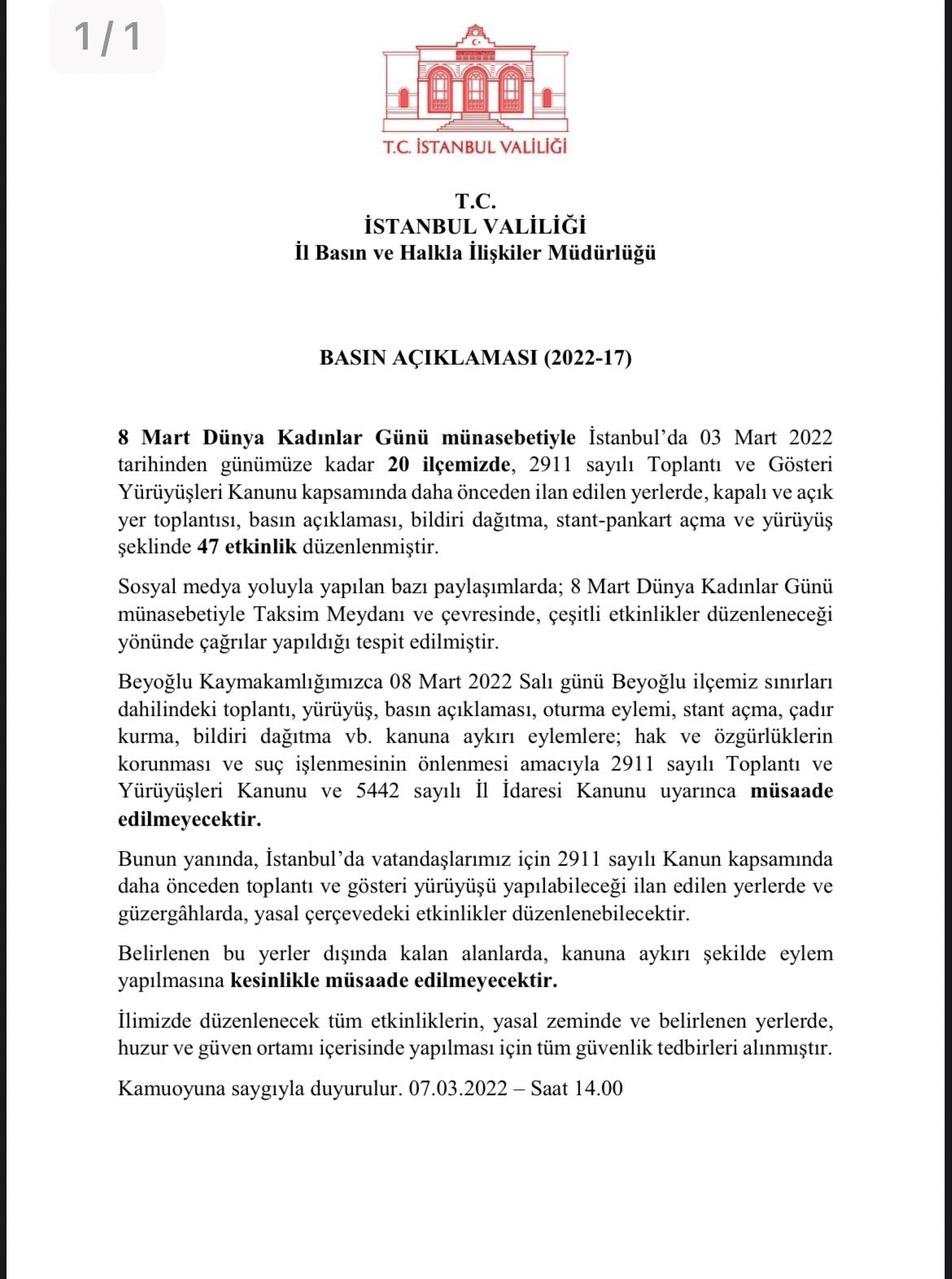 İstanbul Valiliği yarın (8 Mart) gerçekleşecek Feminist Gece Yürüyüşü öncesi, Taksim ve çevresinde bir eyleme “kesinlikle izin verilmeyeceğini” belirten bir basın açıklaması yayımladı. Valilik, yasağa gerekçe olarak “hak ve özgürlüklerin korunması ve suç işlenmesinin önlenmesi”ni gösterdi.