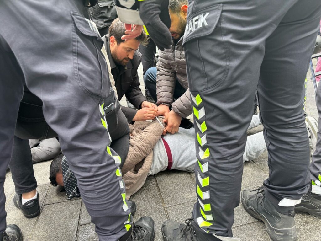 CHP milletvekili Mahmut Tanal, Mecidiyeköy’de gözaltıları engellemek için gözaltı aracına çıktı.