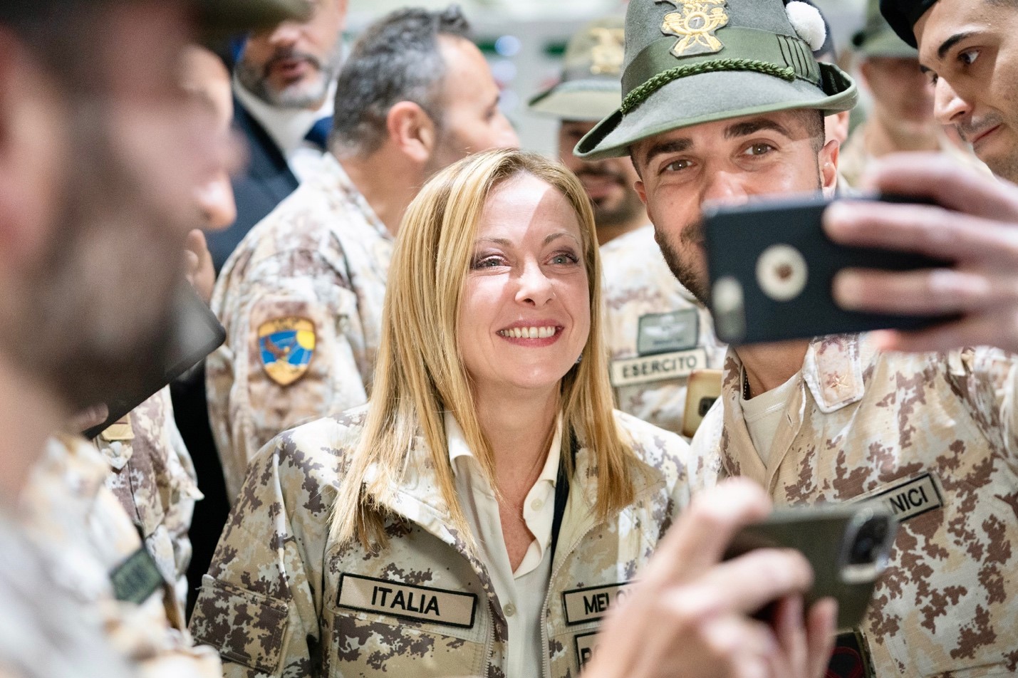 Giorgia Meloni, Irak ziyareti kapsamında Irak’ta NATO görevinde bulunan İtalyan askerleriyle de bir araya geldi, askerlere moral verdi, selfie çektirdi.