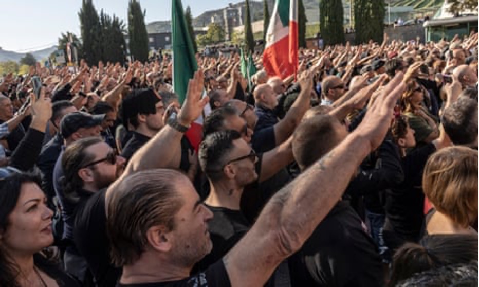 Dün 2.000 İtalyan, Mussolini’nin doğduğu ve gömüldüğü Predappio kentinde toplantı ve Mussolini’nin silahlı destekçileriyle Roma’ya yürüyüp yönetimi ele geçirmesinin 100. yılını kutladı. Yürüyüşe katılanlar faşist sloganlar attı, semboller kullandı ve Mussolini’yi andı. İktidarda olan İtalya’nın Kardeşleri hükümeti ise gösteriye herhangi bir müdahalede bulunmadı. Muhalefetteki merkez sol Demokrat Parti, ise radikal sağ hükümetin bu yürüyüşe müdahale etmeyip 3.000 kişinin terk edilmiş bir depodaki Cadılar Bayramı partisini basması ve dağıtmasını gündeme getirdi, bunun çelişkili bir tutum olduğunu, radikal sağ hükümetin Mussolini’nin anılmasına göz yumduğunu söyledi.
