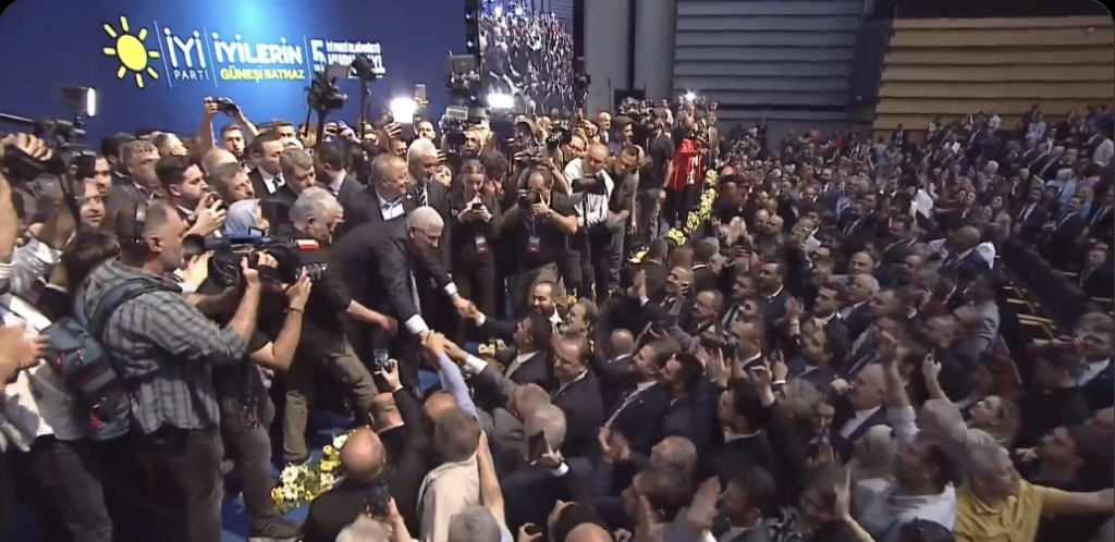 Adaylardan Dervişoğlu, kürsüden mikrofonla uzun süre “İYİlerin umudu’ diye anons edilirken diğer adaylar Akalın ve Aydın’ın salona giriş yaptığı bilgisi verildi ve “Hoş geldiniz” denildi.