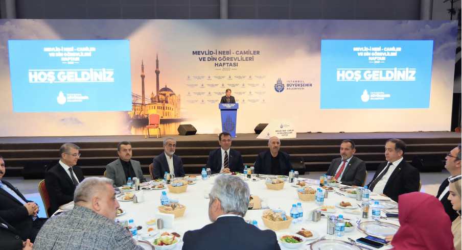 Yenikapı’daki Dr. Mimar Kadir Topbaş Gösteri ve Sanat Merkezi’nde düzenlenen yemek, İBB Karacaahmet Mezarlıklar Müdürlüğü imam-hatibi Mehmet Şahin’in okuduğu Kur’an tilaveti ile başladı. Kur’an tilavetinin ardından İmamoğlu bir konuşma yaptı: