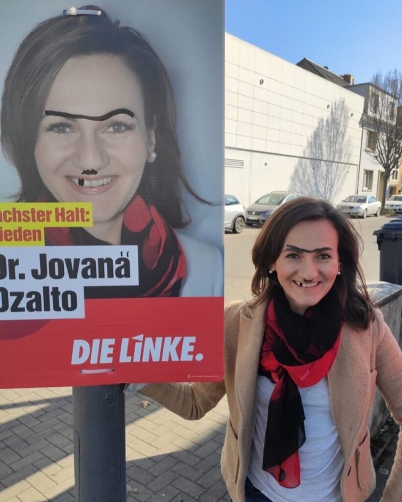 Mart ayındaki eyalet seçimleri öncesinde afişlerdeki fotoğrafına siyah diş, bıyık ve tek kaş çizilen Die Linke adayı Jovana Dzalto, bu harekete özgüven ve mizah dolu bir karşılık verip kendi yüzünü de aynı şekilde çizmiş ve posterle yanyana fotoğraf çektirmişti. Genç adayın Instagram’da da bizzat paylaştığı fotoğrafta şu not yazılı: “Seçmenlerimin taleplerini her daim ciddiye alırım!”