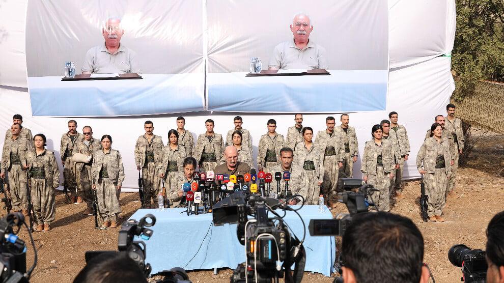 Kandil’de düzenlenen basın toplantısında “Kürt Özgürlük Hareketi Yönetimi” adına Sabri Ok Türkiye’den çekilen 25 PKK’lıyla açıklama yaptı: