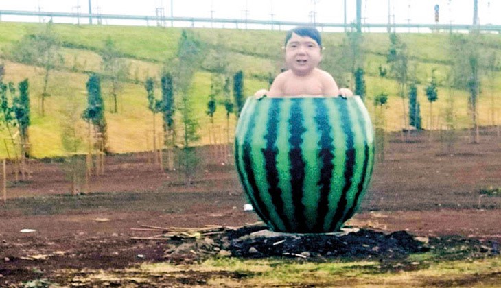Karpuz yerinde dururken, içindeki çocuk maketi revize edilmek üzere kaldırıldı.