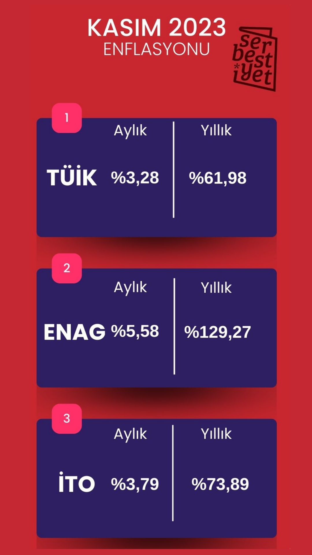Kasım ayındaki enflasyon oranları açıklandı. Aylık enflasyon TÜİK'e göre %3,28, ENAG'a göre %5,58, İTO'ya göre %3,79 olurken yıllık enflasyon ise TÜİK'e göre %61,98, ENAG'a göre %129,27 ve İTO'ya göre %73,89 oldu.