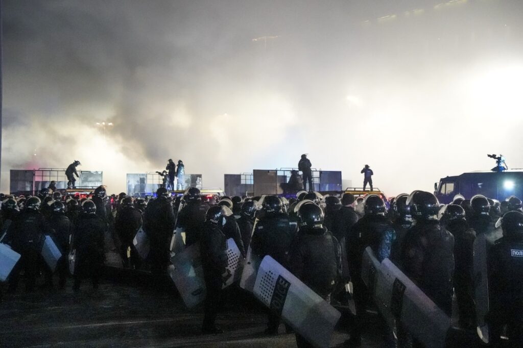Tokayev’in bu konuşmayı yaptığı sıralarda ülkenin en büyük şehri ve eski başkenti Almatı’da polis, göstericilerin belediye binasına girmesini engellemek için göz yaşartıcı gaz ve elektroşok tabancaları kullanıyordu: