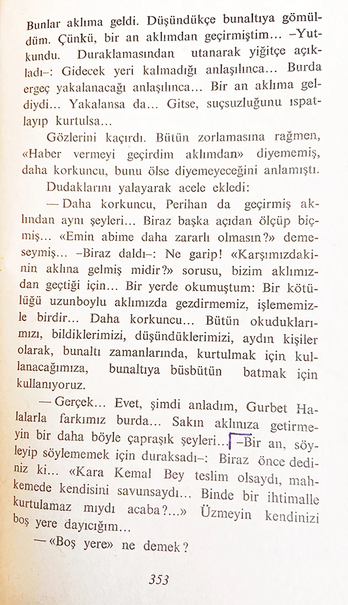 -Bir an, söyleyip söylememek için duraksadı-: Biraz önce dediniz ki… “Kara Kemal Bey teslim olsaydı, mahkemede kendisini savunsaydı… Binde bir ihtimalle kurtulmaz mıydı acaba?…” Üzmeyin kendinizi boş yere dayıcığım…