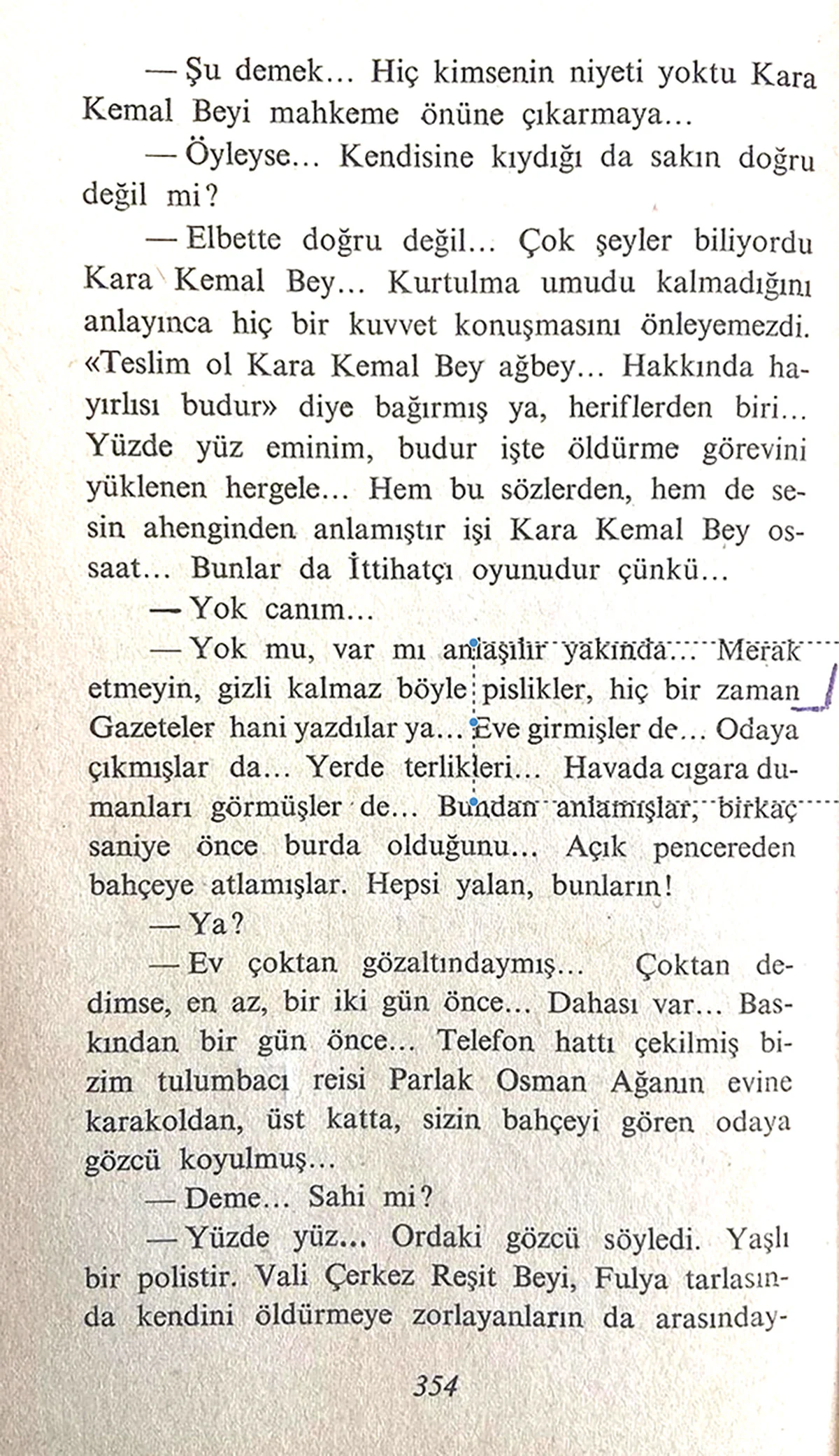 -Elbette doğru değil… Çok şeyler biliyordu Kara Kemal Bey… Kurtulma umudu kalmadığını anlayınca hiçbir kuvvet konuşmasını önleyemezdi. “Teslim ol Kara Kemal Bey ağabey… Hakkında hayırlısı budur.” diye bağırmış ya heriflerden biri… Yüzde yüz eminim, budur işte öldürme görevini yüklenen hergele… Hem bu sözlerden, hem de sesin ahenginden anlamıştır işi Kara Kemal Bey ossaat… Bunlar da İttihatçı oyunudur çünkü…